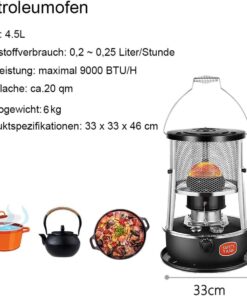 - ☞【High calorific value】The combustion efficiency of the kerosene heater is 99.8%, the calorific value is high, and the heating area is large. Has a good heat output with a maximum heat output of 9000 BTU/H (equivalent to 2300 W) and a fuel consumption of 0.25 l per hour. It can quickly heat a space of about 20 square meters.