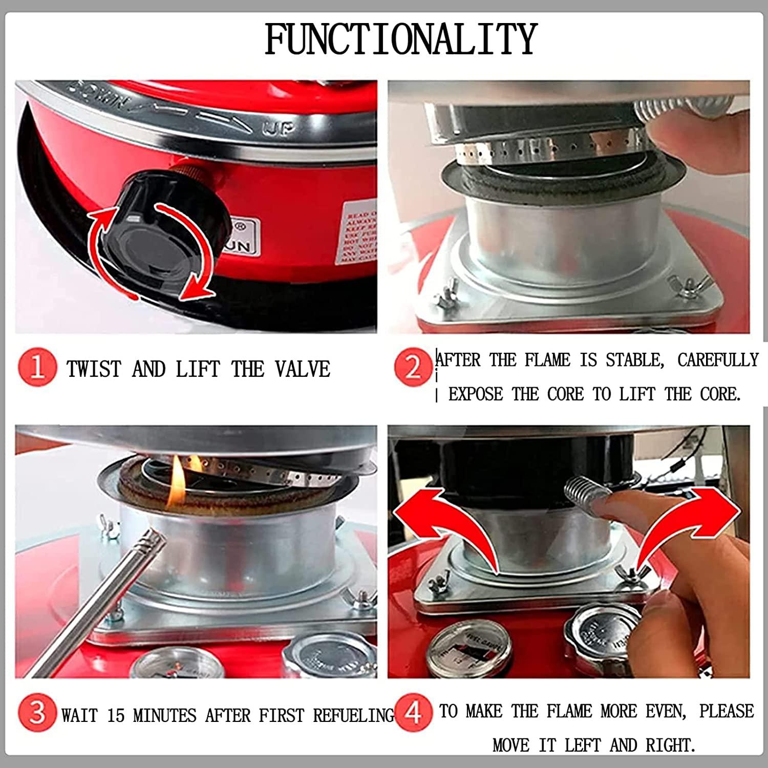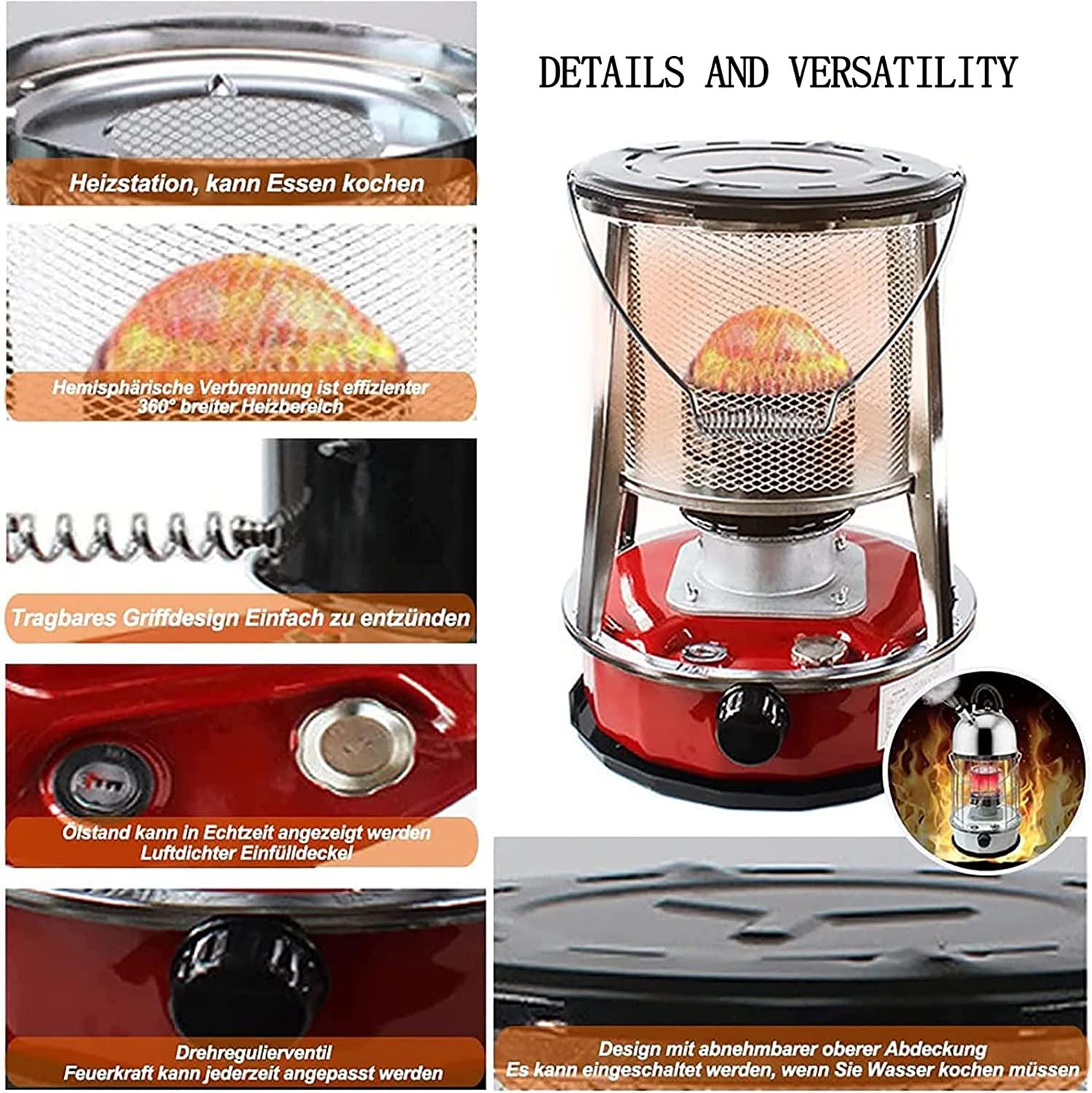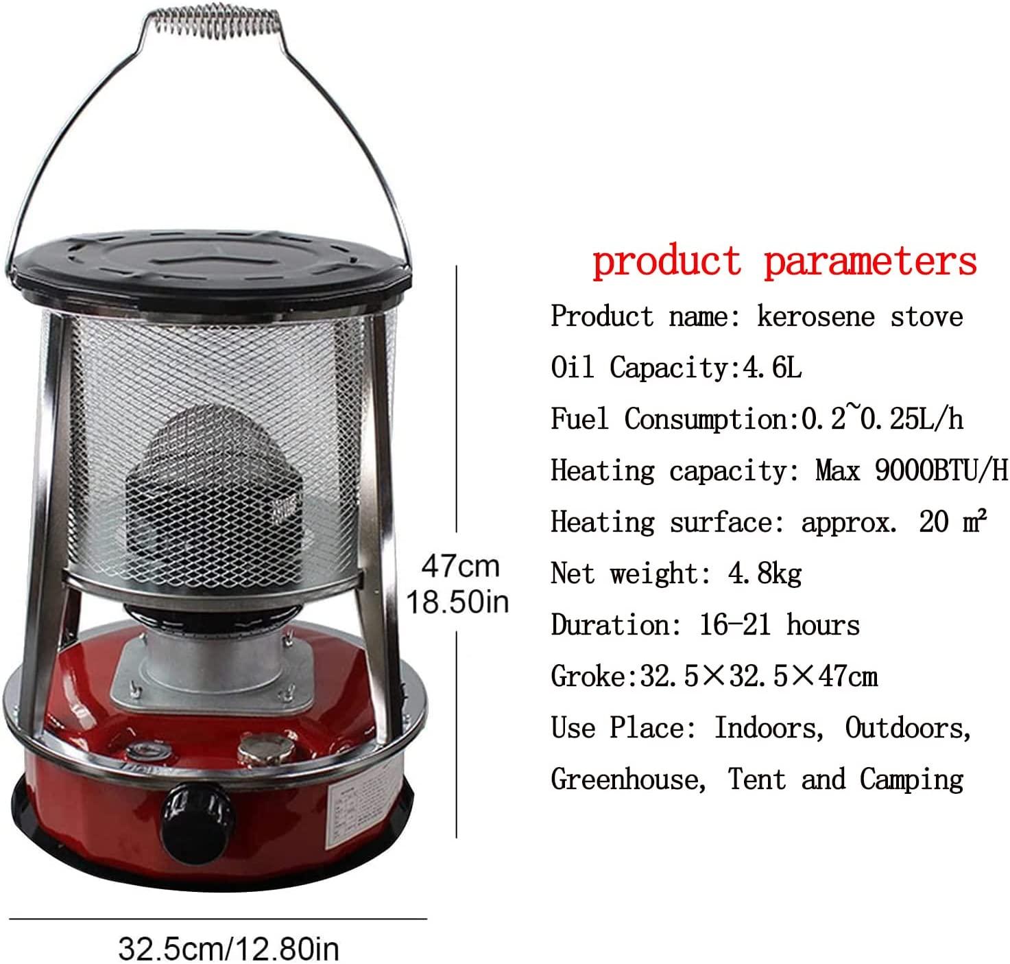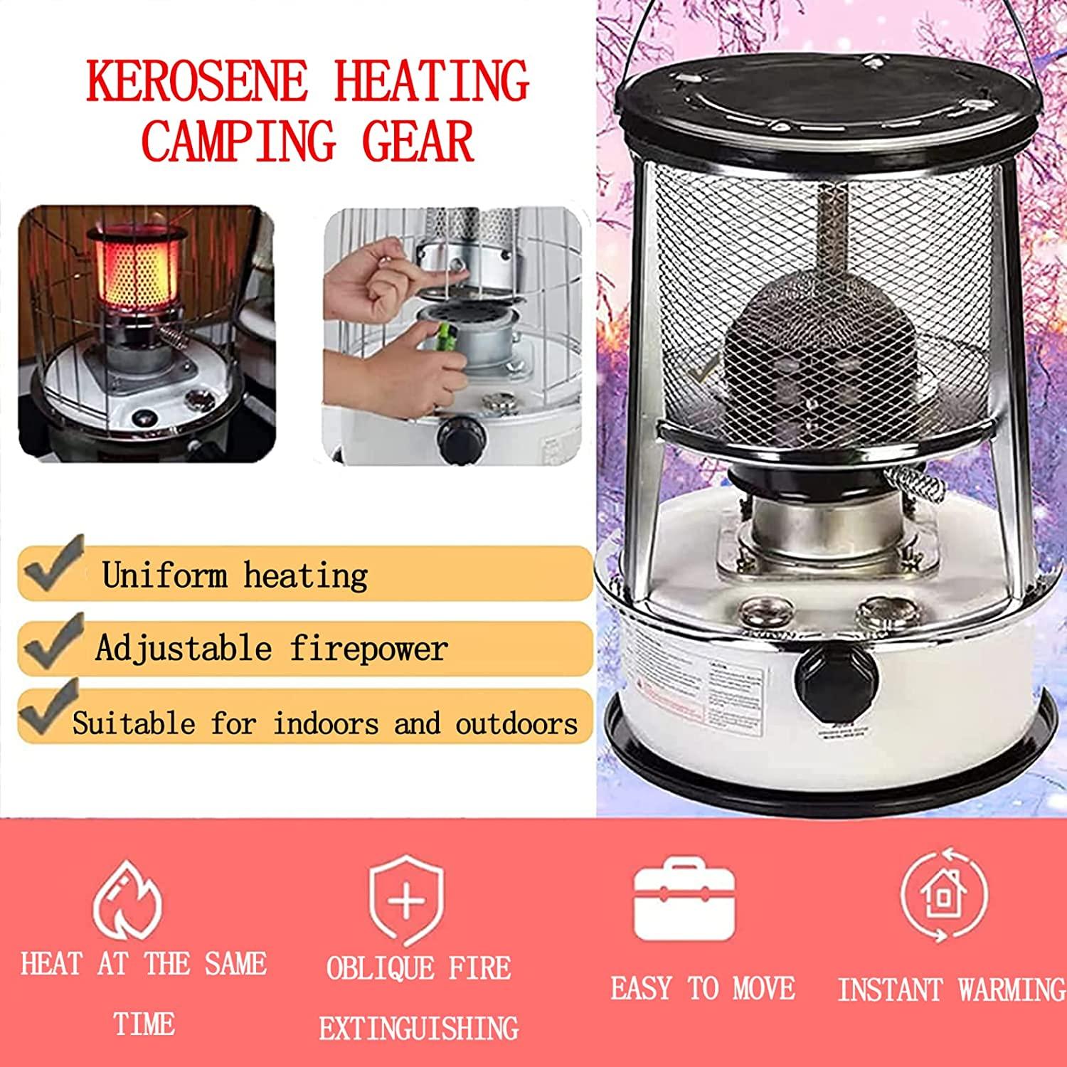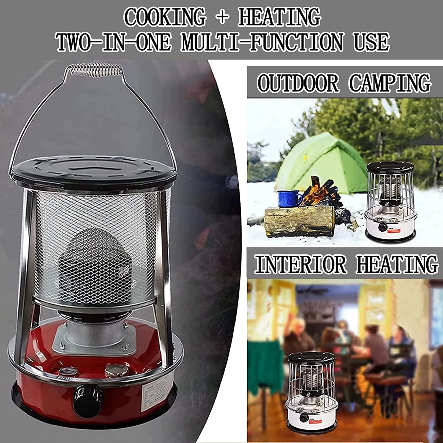- ADJUSTMENT KNOB: Petroleum heater has a rotary valve that can regulate the fire power according to your needs; no noise and no glare, easy to use every night. The heating table on the top can be used as a work table for food preparation.