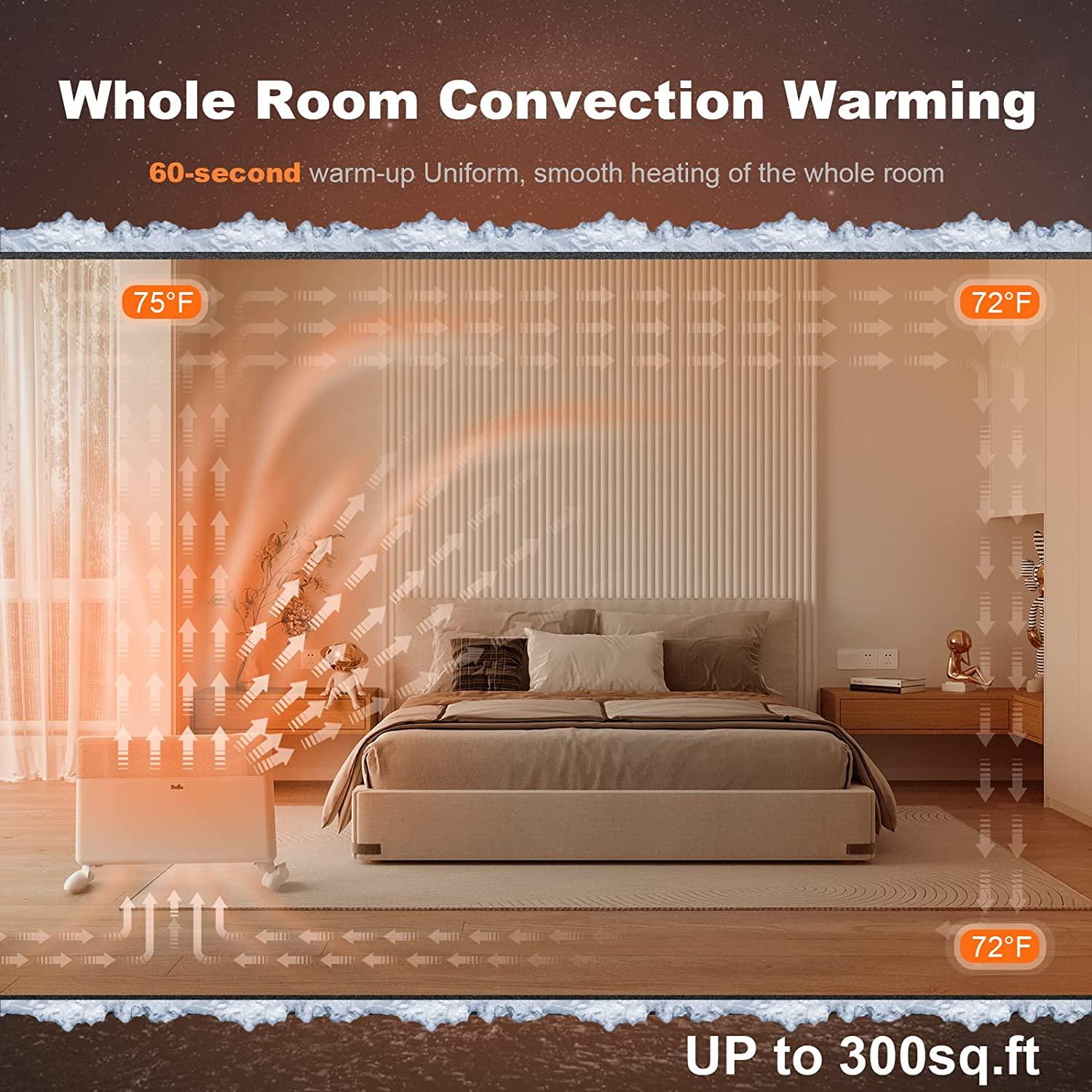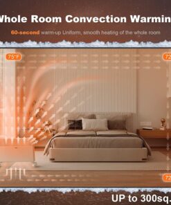 - Heat Up in 60s:You can feel the warmth after turn on the heater less than 60seconds.It takes about 1-2 hours to warm the whole room evenly,the exact time needed depends on the size and warmth of the room.Up to 300sq(almost 17×18) room.