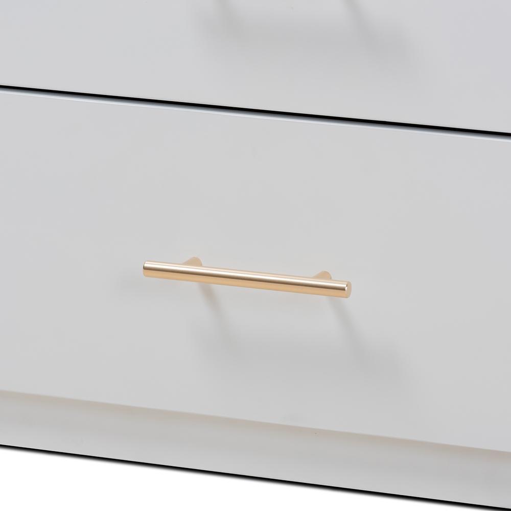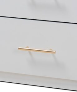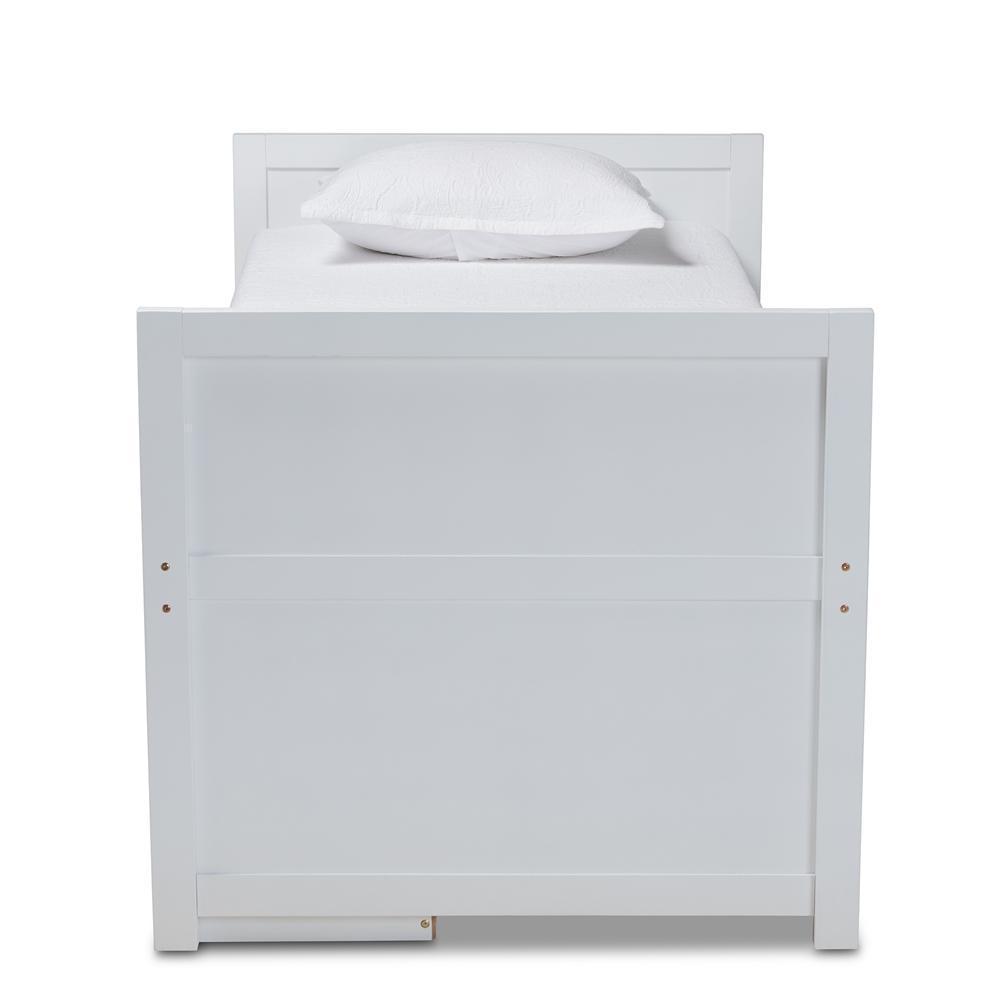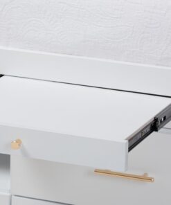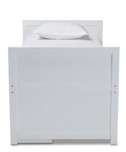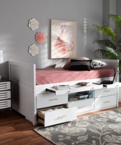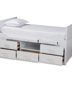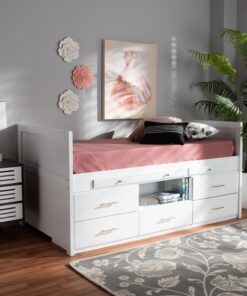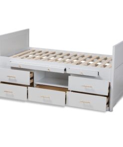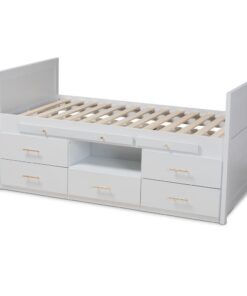 Functioning as a bed, dresser, and desk in one, the Mirza bed takes versatility to new heights. Made in Malaysia, this wooden bed features a sleek white finish that brightens any space. Five spacious drawers provide ample space to store clothes, while an open shelf provides room to display books. Designed with the utmost functionality in mind, the Mirza is also fitted with two pull-out panels that can be used as both a desk and shelf. Its clean white finish and gold-tone metal hardware lends a sleek look, while inset detailing conveys modern elegance. Requiring assembly, the Mirza bed is the quintessential piece for any kid’s room.