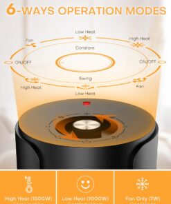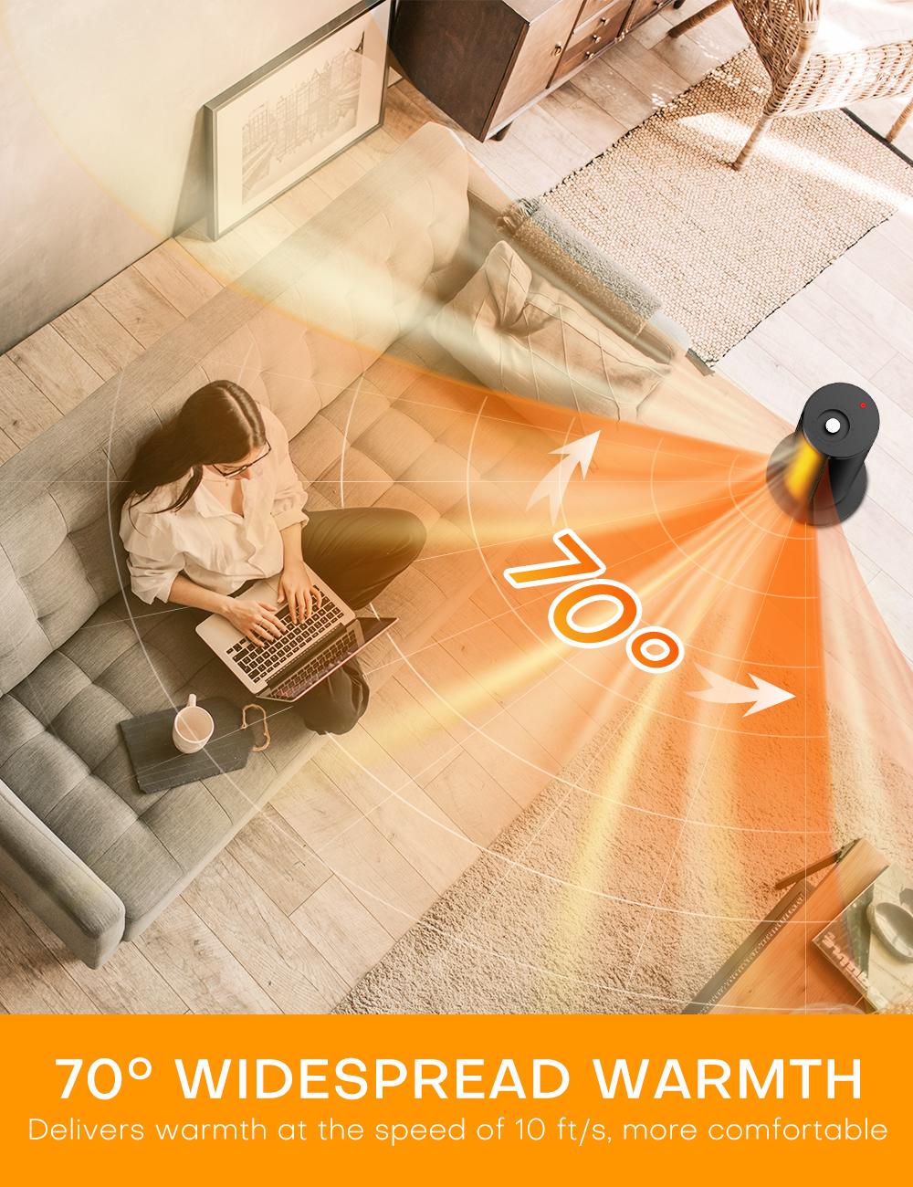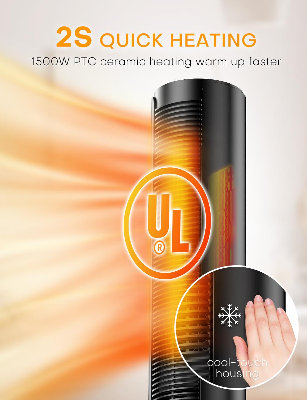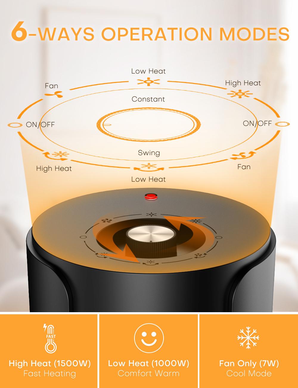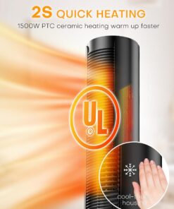 Heats quickly in 2 seconds thanks to 1500W ceramic heating elements, an intelligent adjustable thermostat, it can release hot/cool air for keeping a great air cycle. Once it induces the temp is lower/higher than set, the heater will re-heat/ cooling-down for more comfort. Delivering hot air around the bedroom/living room/office quickly, pushing air farther away evenly that keeps everyone in the room comfortable on cold days.
