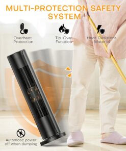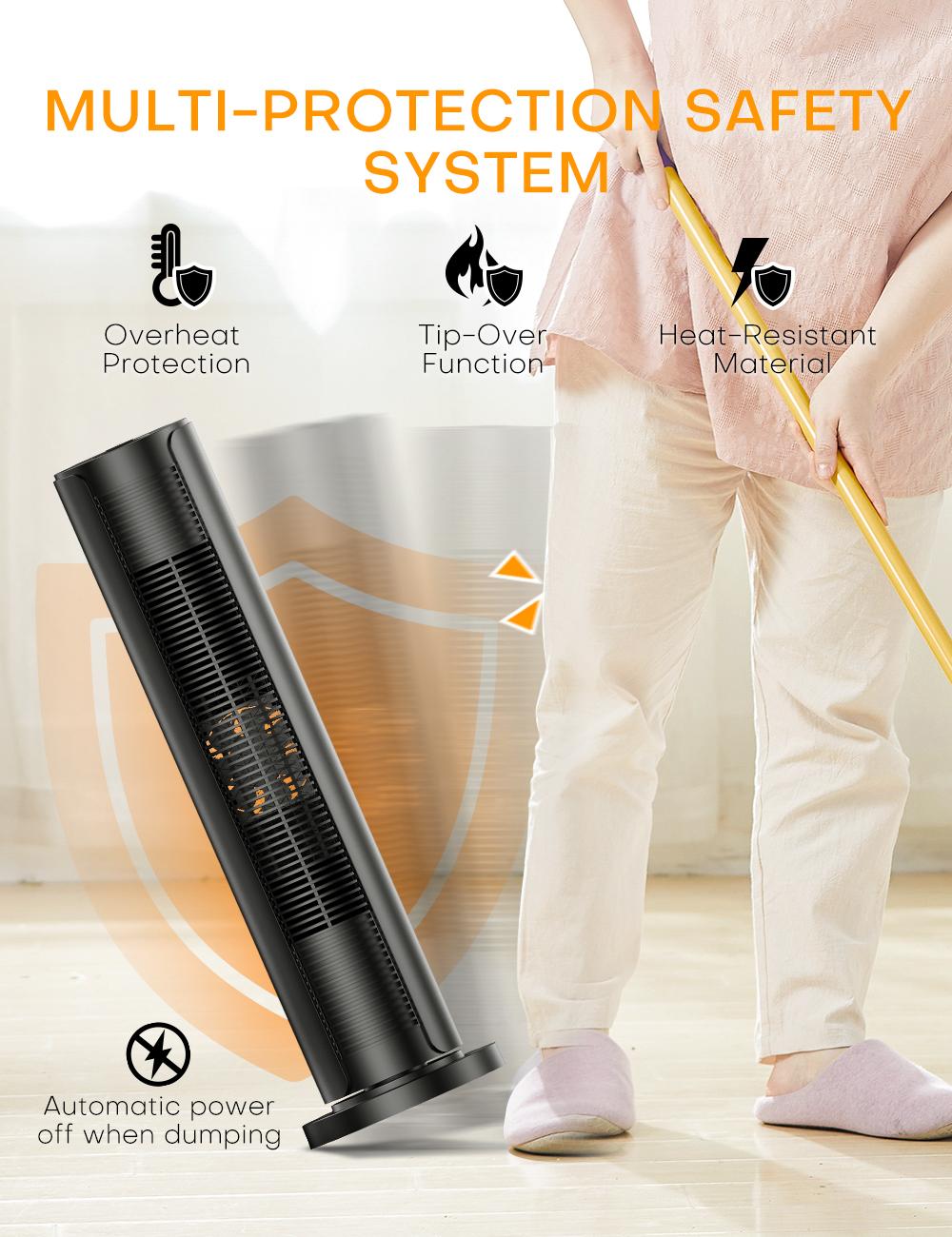 You could easily control the heater from 16.4 feet away without getting up from bed or sofa.The safety tip-over switch of our room heaters for indoor usecan automatically shuts off the tower heater if it gets knocked over accidentally to avoid accident happened. Overheat Protection system will shut the portable heater off when the parts of the heater overheat. In this way the space heater for indoor use will cool down quickly to avoid overheating.