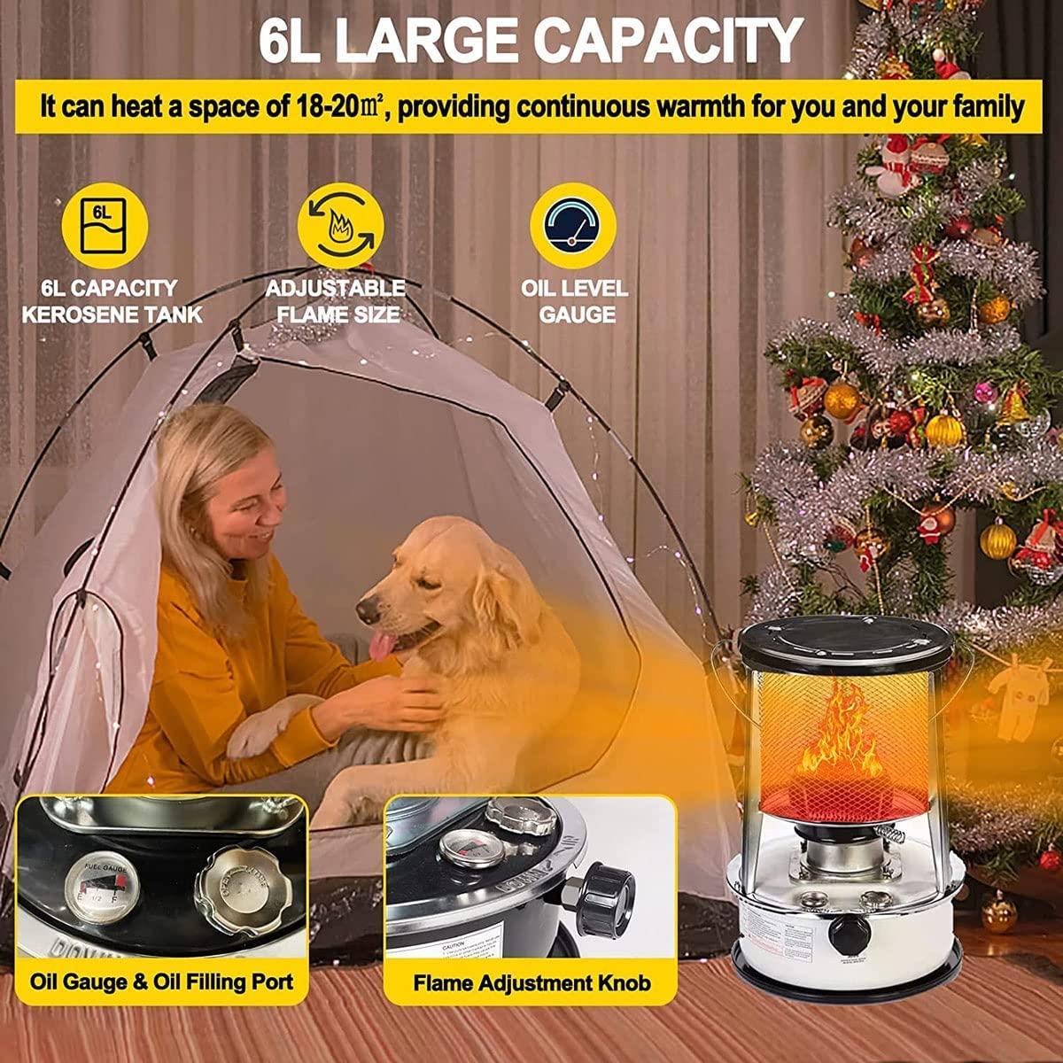 - ❤ Fuel tank capacity-The fuel tank capacity of this kerosene stove heater is 6L, which can burn for 15-20 hours. The visual oil gauge allows you to accurately grasp the remaining oil level.