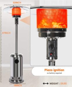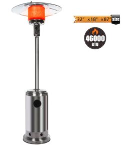 46,000 BTUs of Heat : The heavy-duty patio heater offers an impressive heat output of 46,000 BTUs. Mid-winter merry-making? No problem. Even more, the unit heats a wide area with a range of up to 32.8 feet in diameter. A nice alternative to a fire pit, the gas patio heater delivers quiet, soothing, consistent heat–with no smoke or open flames to worry about