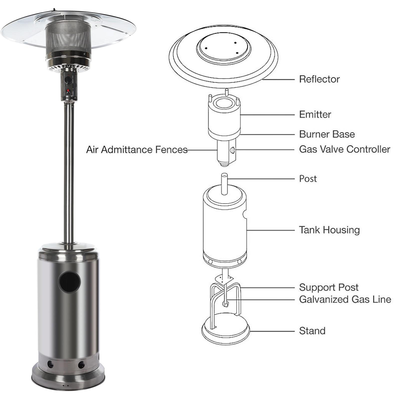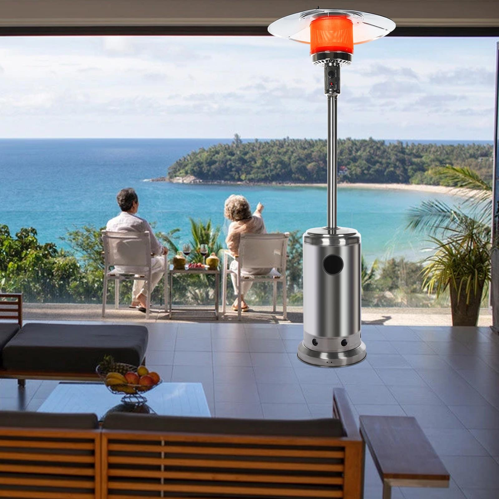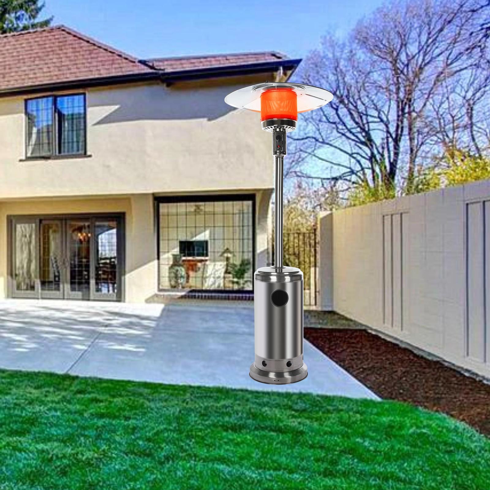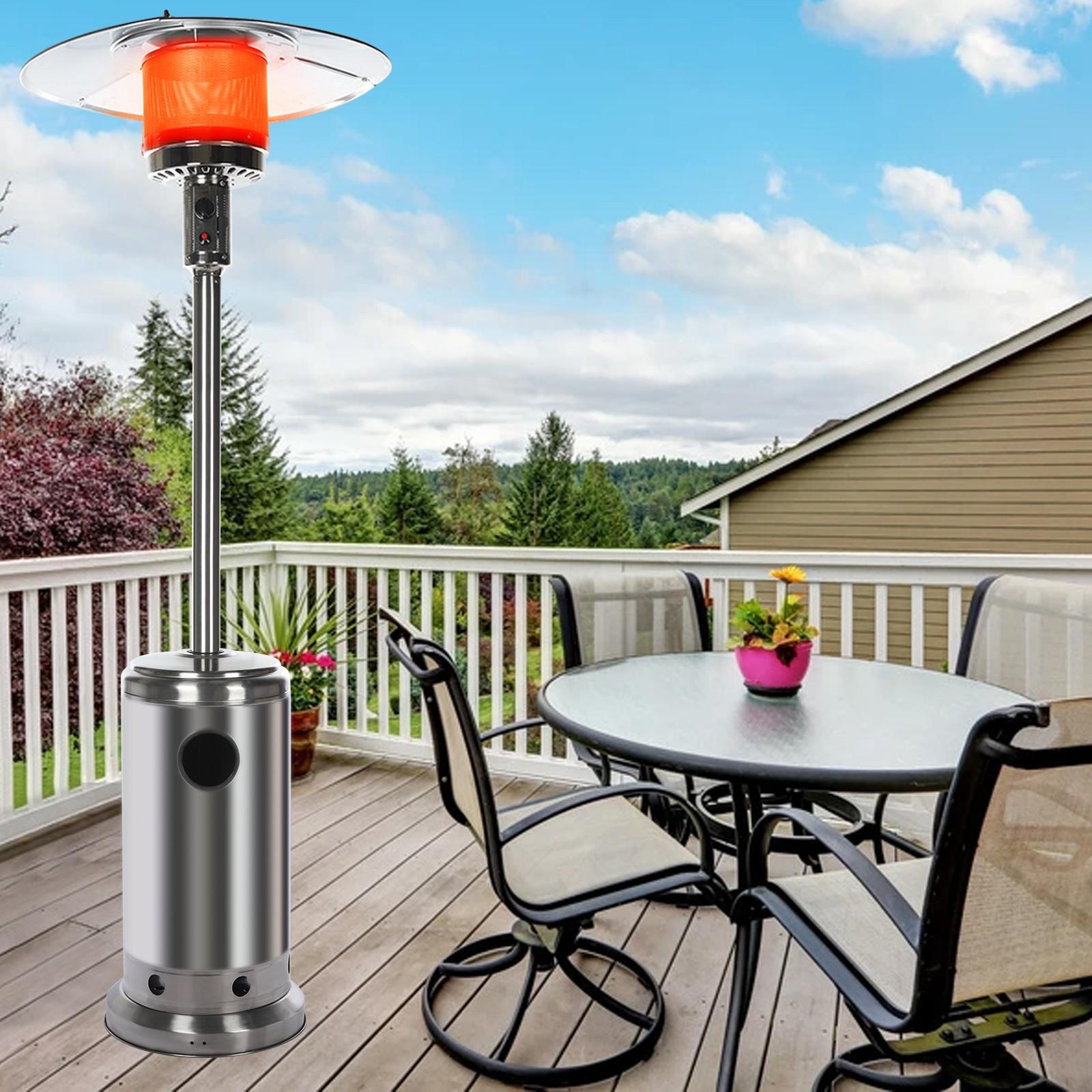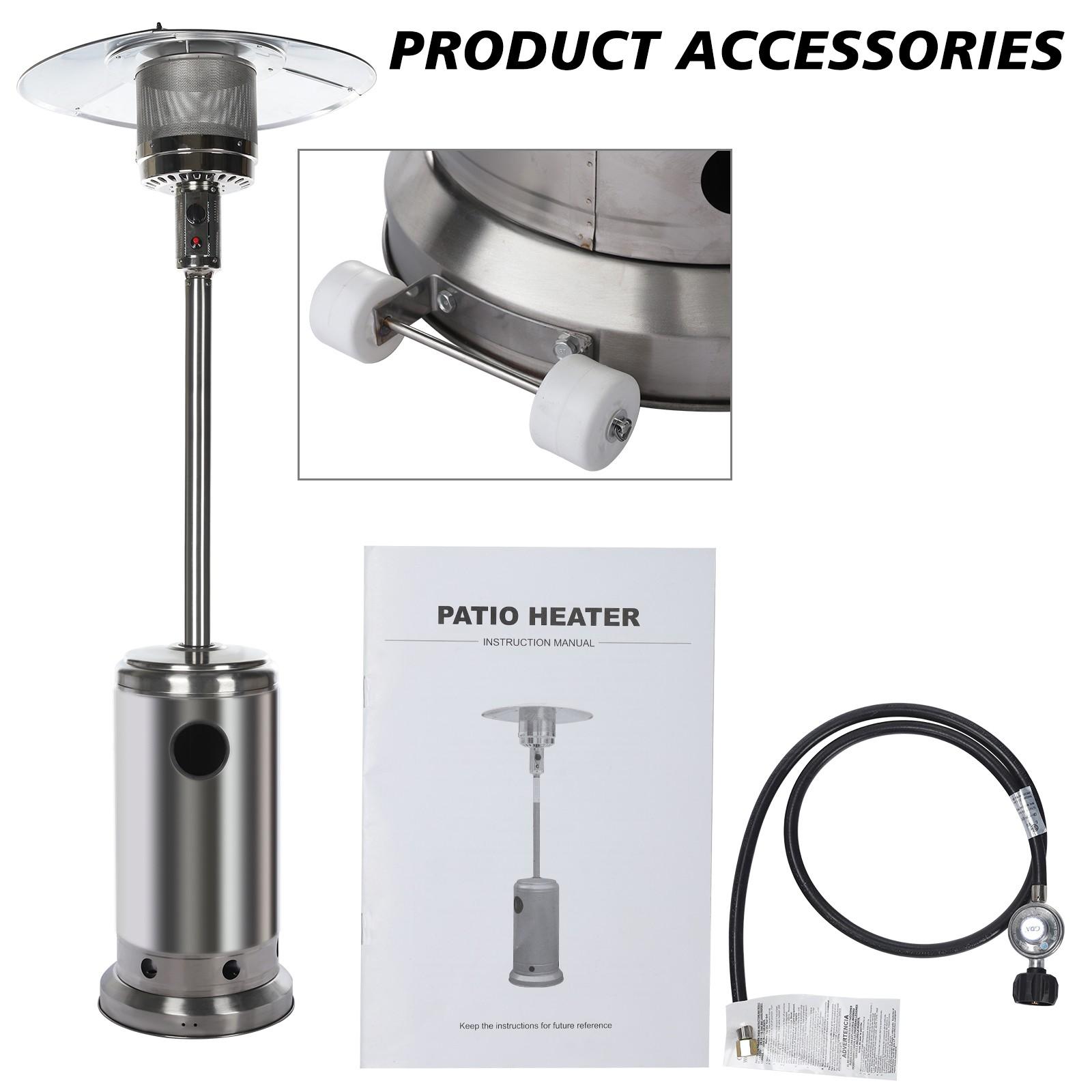Wheels for Smooth Mobility :A wheel assembly with two smooth-rolling wheels comes included, making it easy to transport the outdoor heater from poolside to patio or from one side of the deck to the other; Heat Output: 46,000 BTU; Heat Range: 10m(32.8′ Radius) Patio heater: