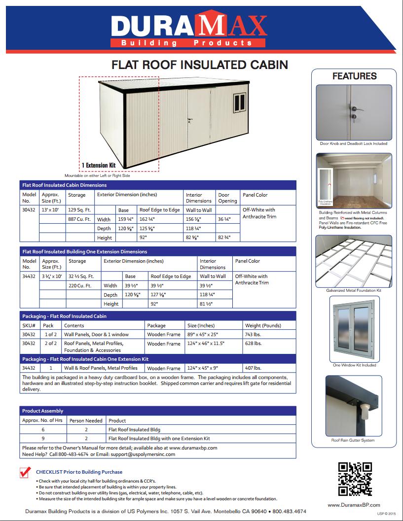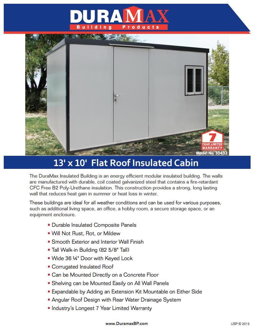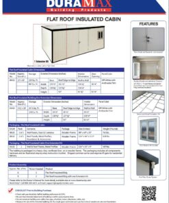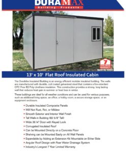The Duramax Insulated Flat Roof Building is an energy efficient modular insulated building. Walls are manufactured with durable coil-coated galvanized steel that sandwiches a fire-retardant CFC-Free Poly-Urethane insulation. This construction provides a strong, long-lasting wall that reduces heat gain in summer or heat loss in winter.