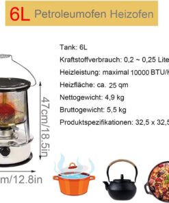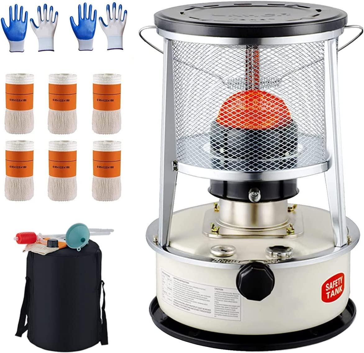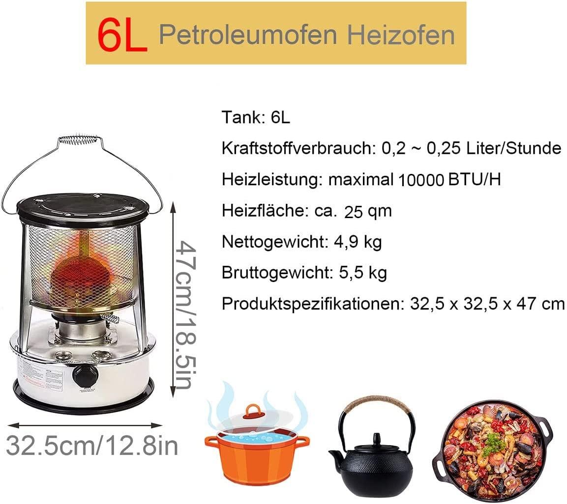 - ☞【More efficient kerosene heating】The combustion chimney of the indoor portable kerosene stove without electricity is made of special metal, which makes the kerosene burn completely, and the heating is faster and more efficient. The oil heater has 6 wicks and 2 gloves.We have two options of 4.6L and 6L, please purchase according to your needs.