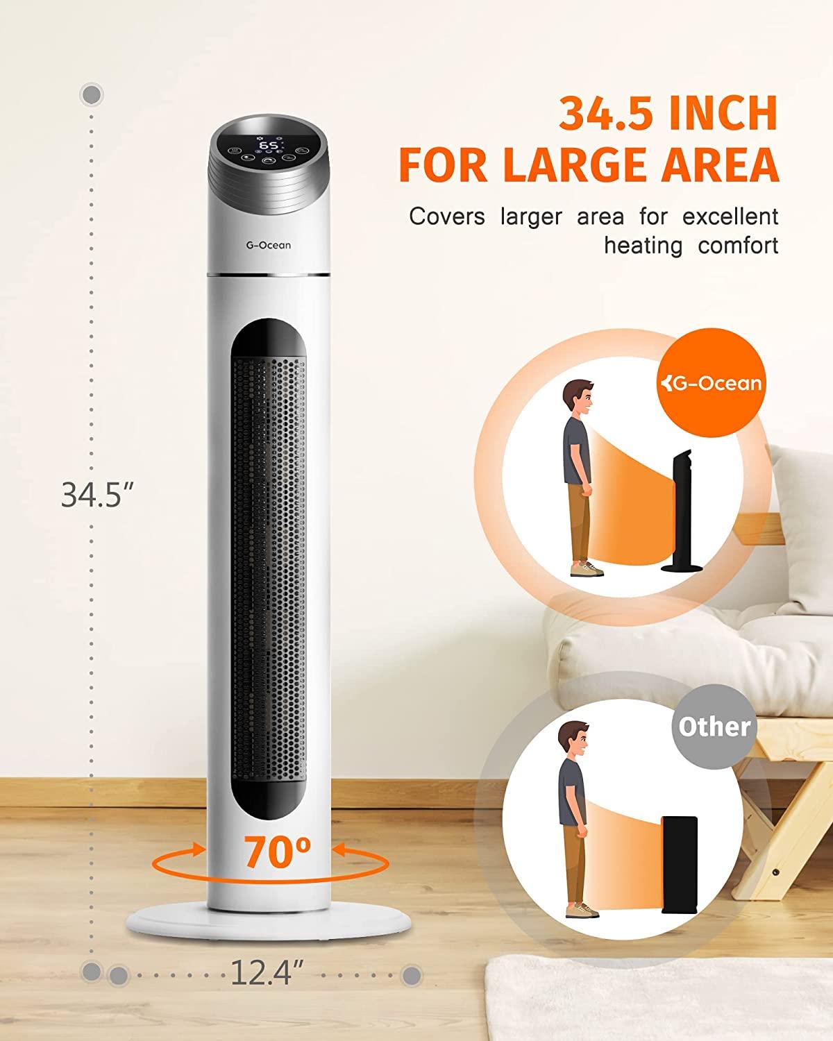 - GET SAFE PRODUCT – Worried about damaging electric circuits or starting a fire?Ralax! The over-heating & 45°over-tip protection promise this safe tower heater shut-off automatically, once it overheats or is knocked down by children or pets. As soon as you have this portable space heater, You can completely discard these concerns. ETL listed, G-Ocean space heater will offer all the consumers a 1-Year manufacture with your purchase. Feel to contact us at any time!