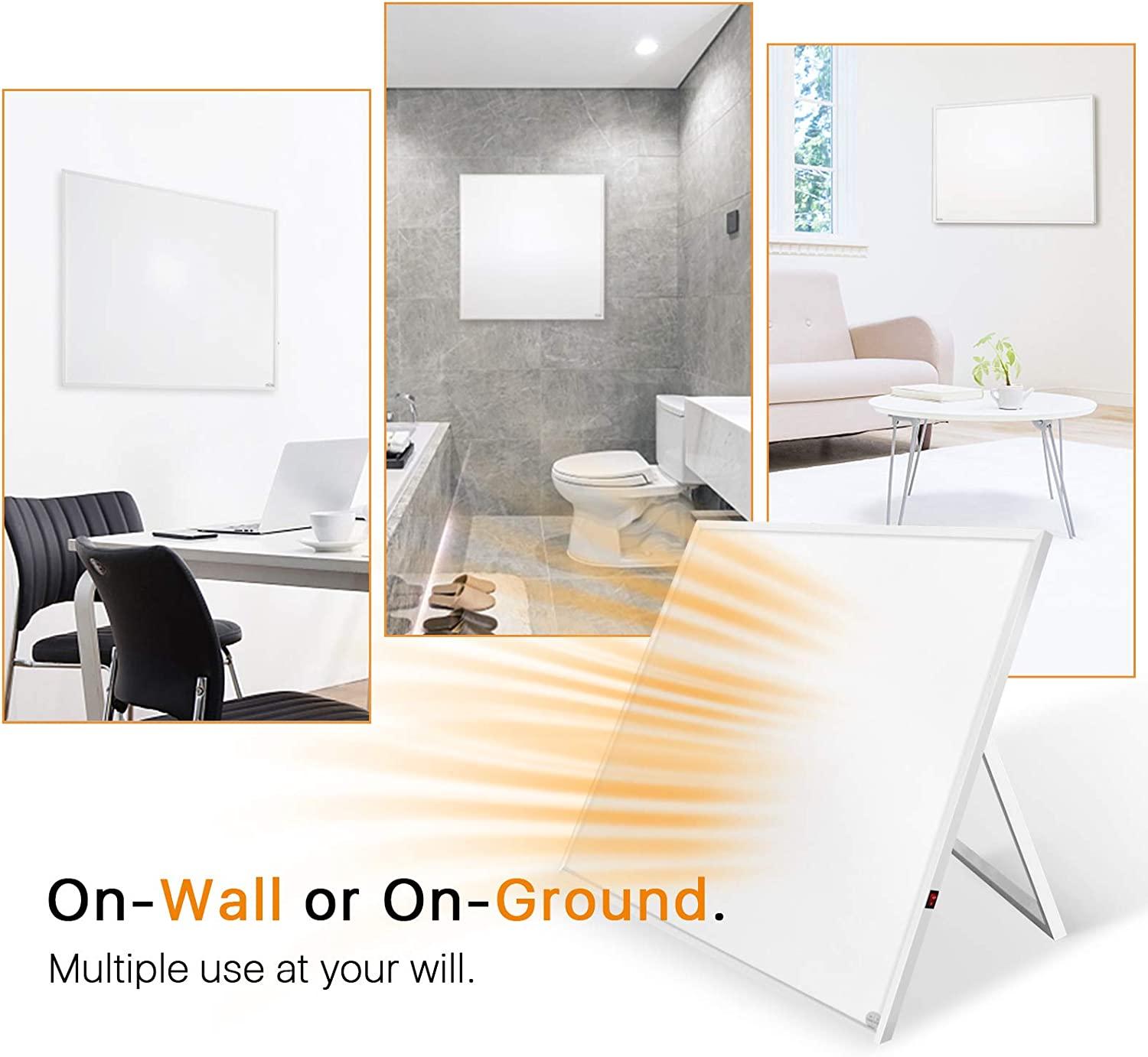 - 【Portable and Writable and Stylish】Portable with an al-alloy square back stand. Thanks to its lightweight and stylish design, it is very easy and comfortable to carry and place. The white surface is applicable for writing and painting as a white board .This innovative, sleek, white gloss panel offer a stylish heating solution. It is specifically designed to blend in with a room seamlessly without disrupting a room’s looks or décor.