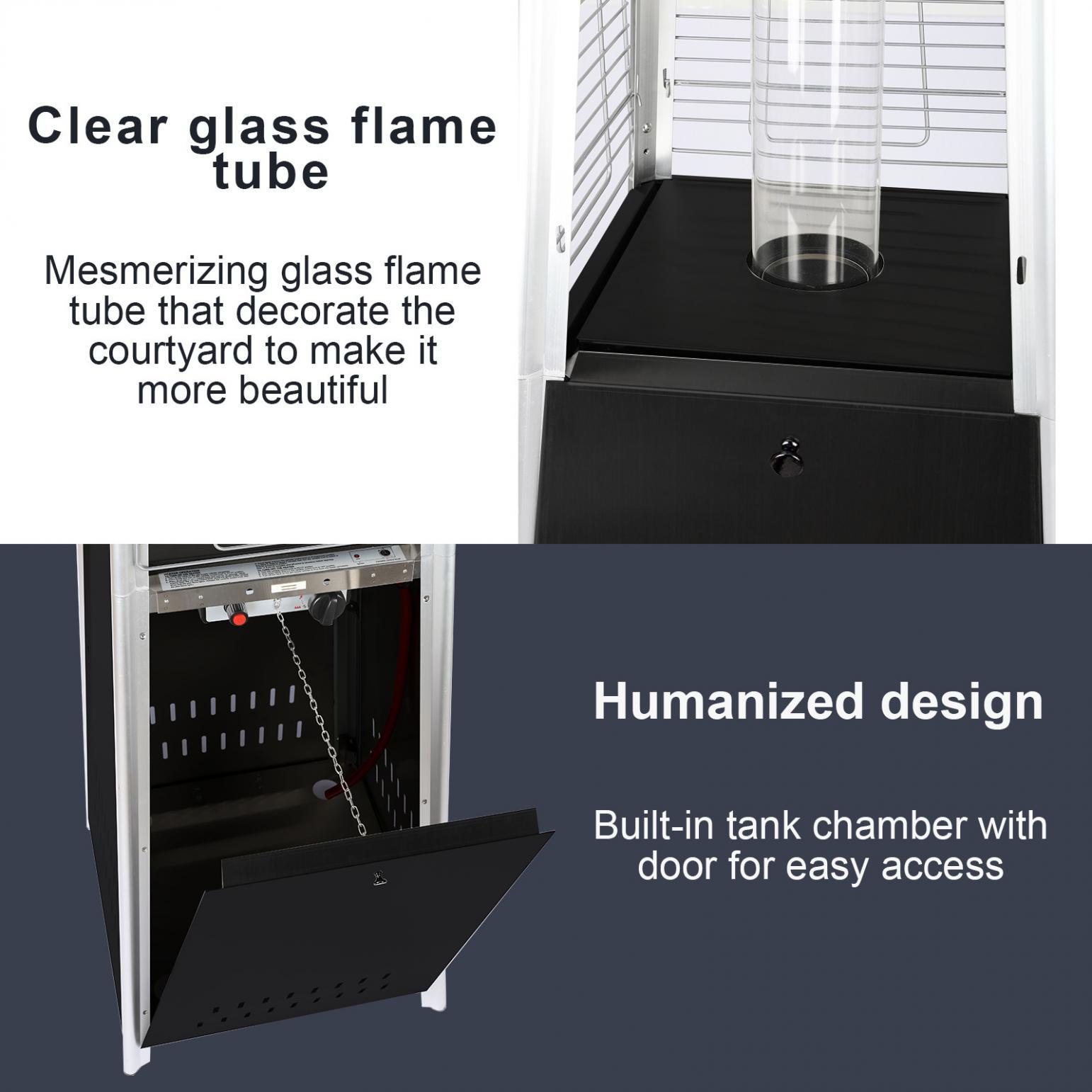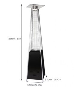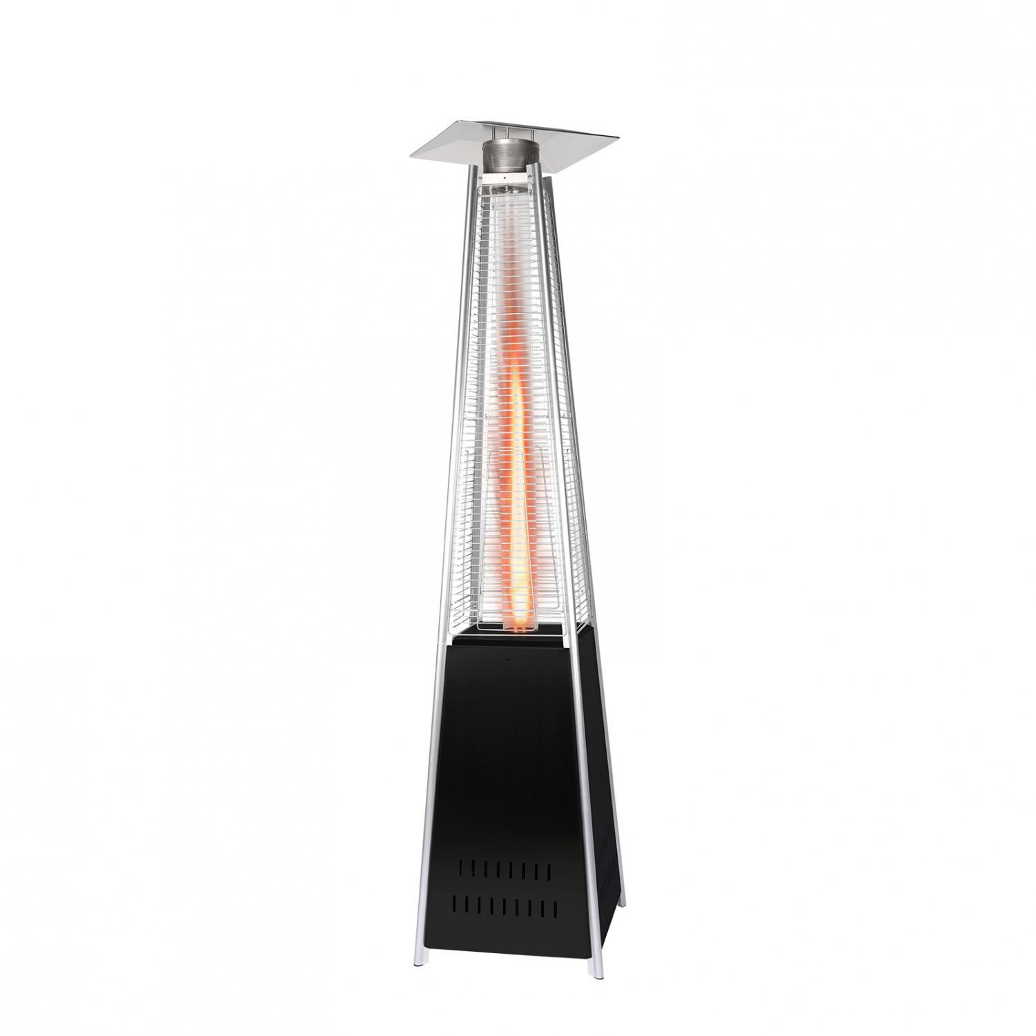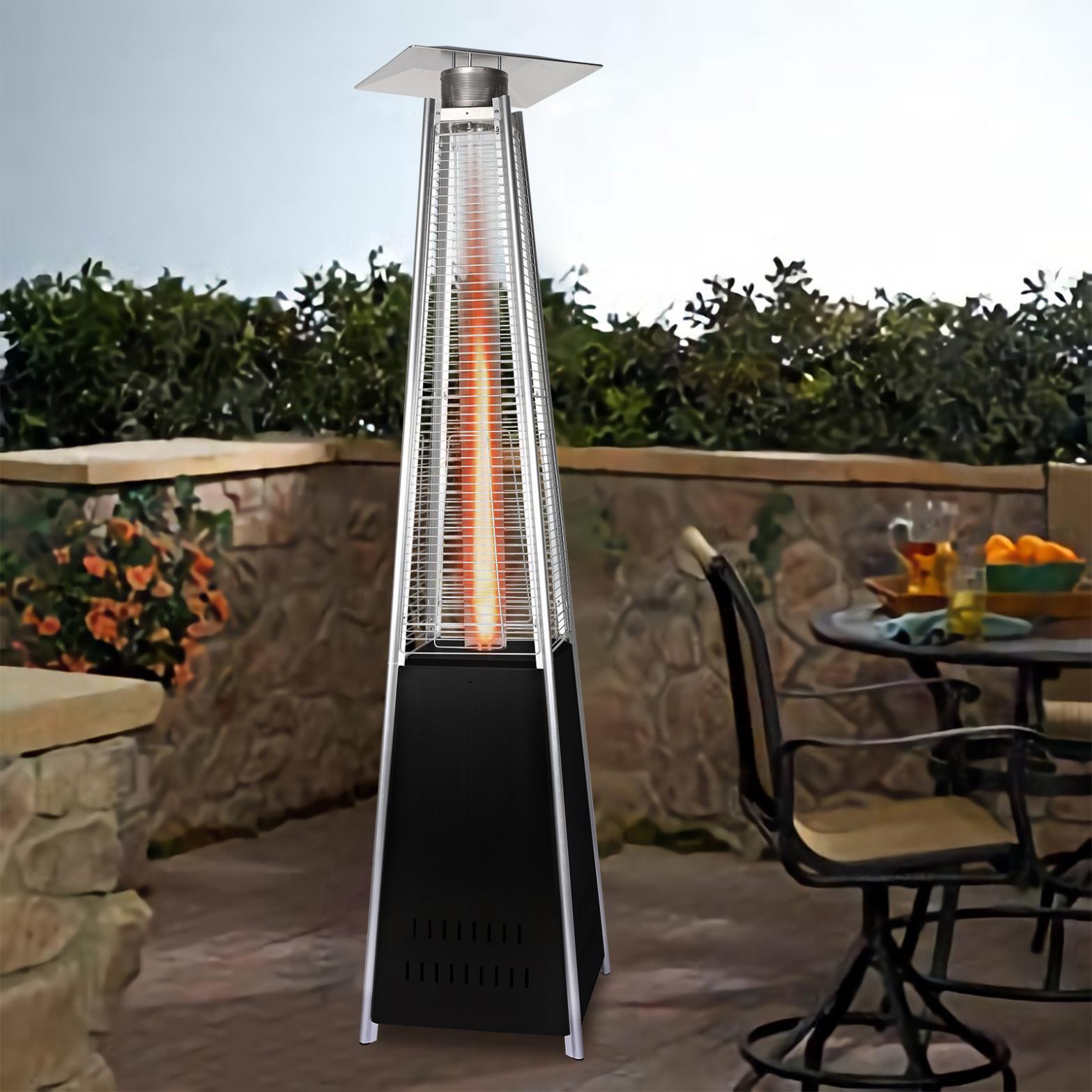 - This 87 inch tall outdoor patio heater features a mesmerizing glass flame tube that is guaranteed to liven up any atmosphere. The long-lasting, stainless steel finish is sure to catch the eye of your partygoers.The latest in design and heat, the Quartz Glass Tube Flame Heater brings style to outdoor heating. Its unique, visually mesmerizing flame provides heat in every direction