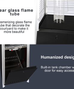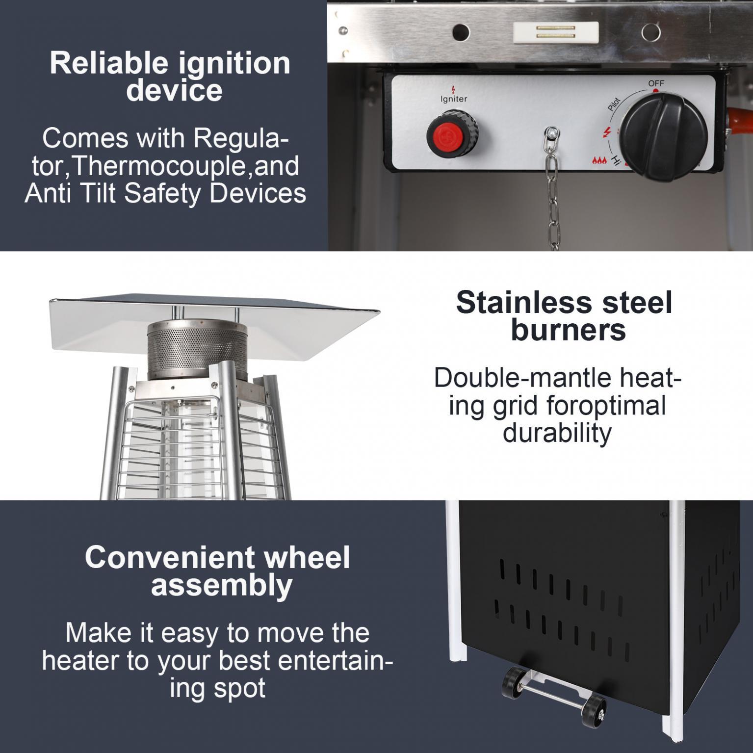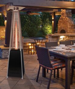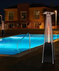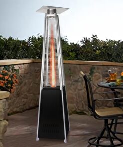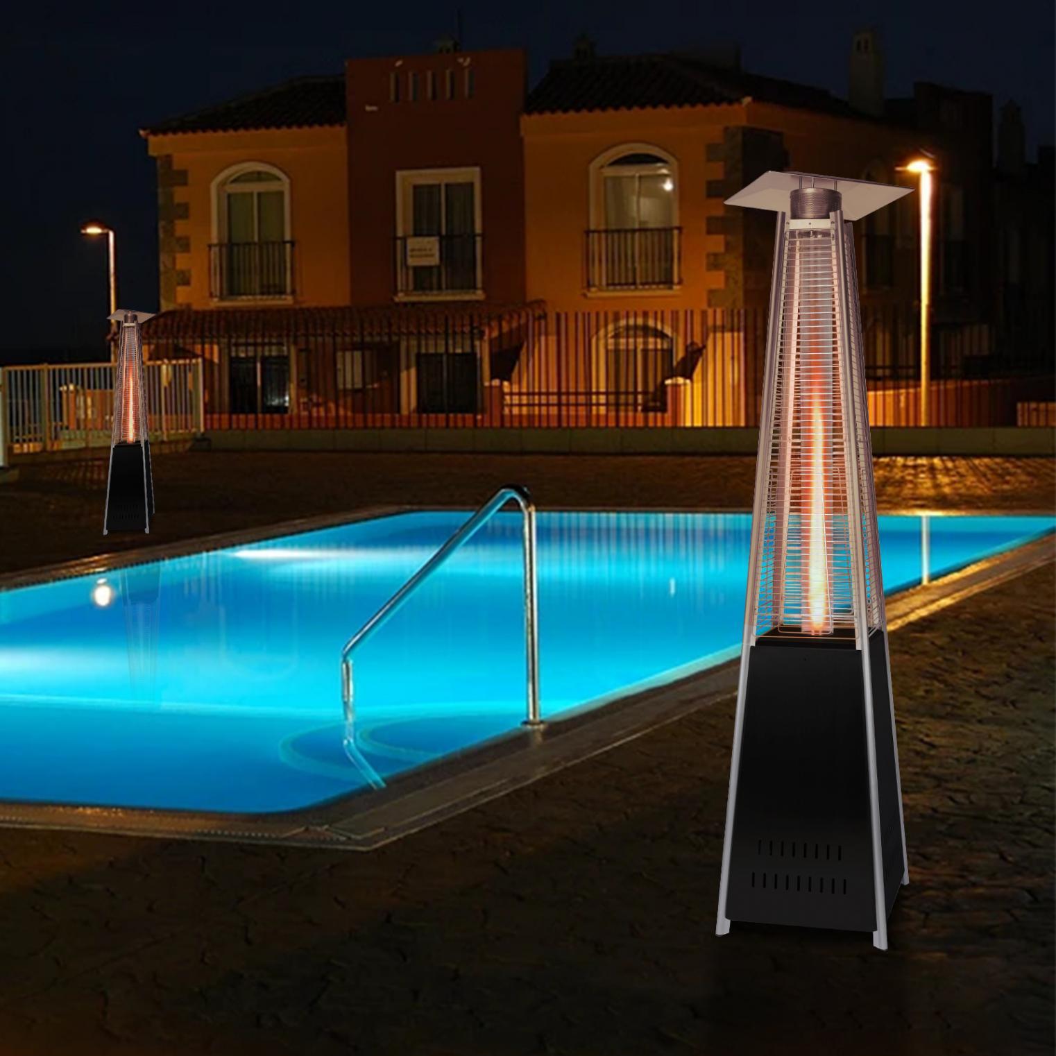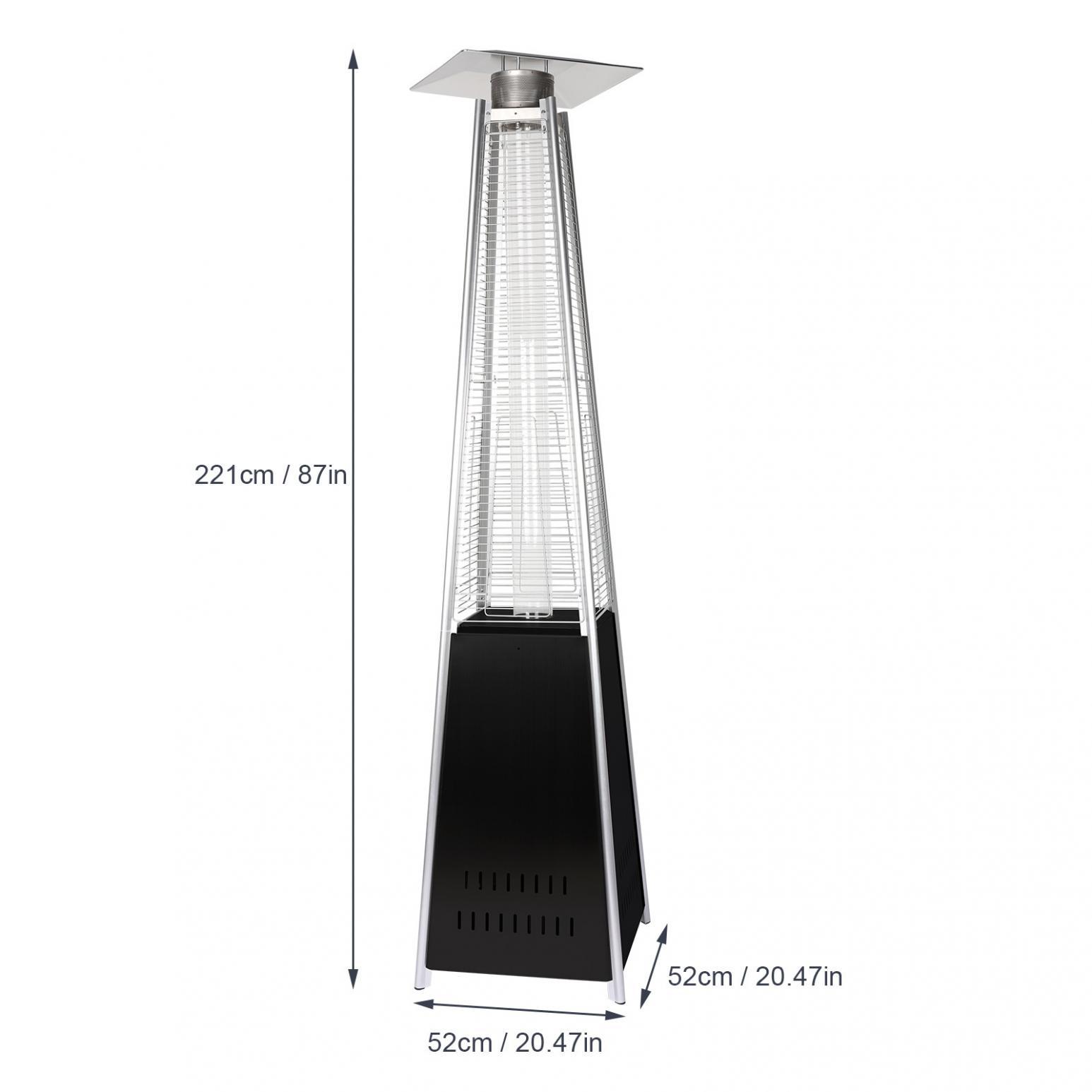 - This 87 inch tall outdoor patio heater features a mesmerizing glass flame tube that is guaranteed to liven up any atmosphere. The long-lasting, stainless steel finish is sure to catch the eye of your partygoers.The latest in design and heat, the Quartz Glass Tube Flame Heater brings style to outdoor heating. Its unique, visually mesmerizing flame provides heat in every direction