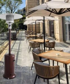 - Easy to assemble patio heater set is applicable to use with propane or butane gas only. It features a round table for maximum convenience, and it’s wide enough to place a set of wine glasses. The table is adjustable and can also be completely removed when not in use