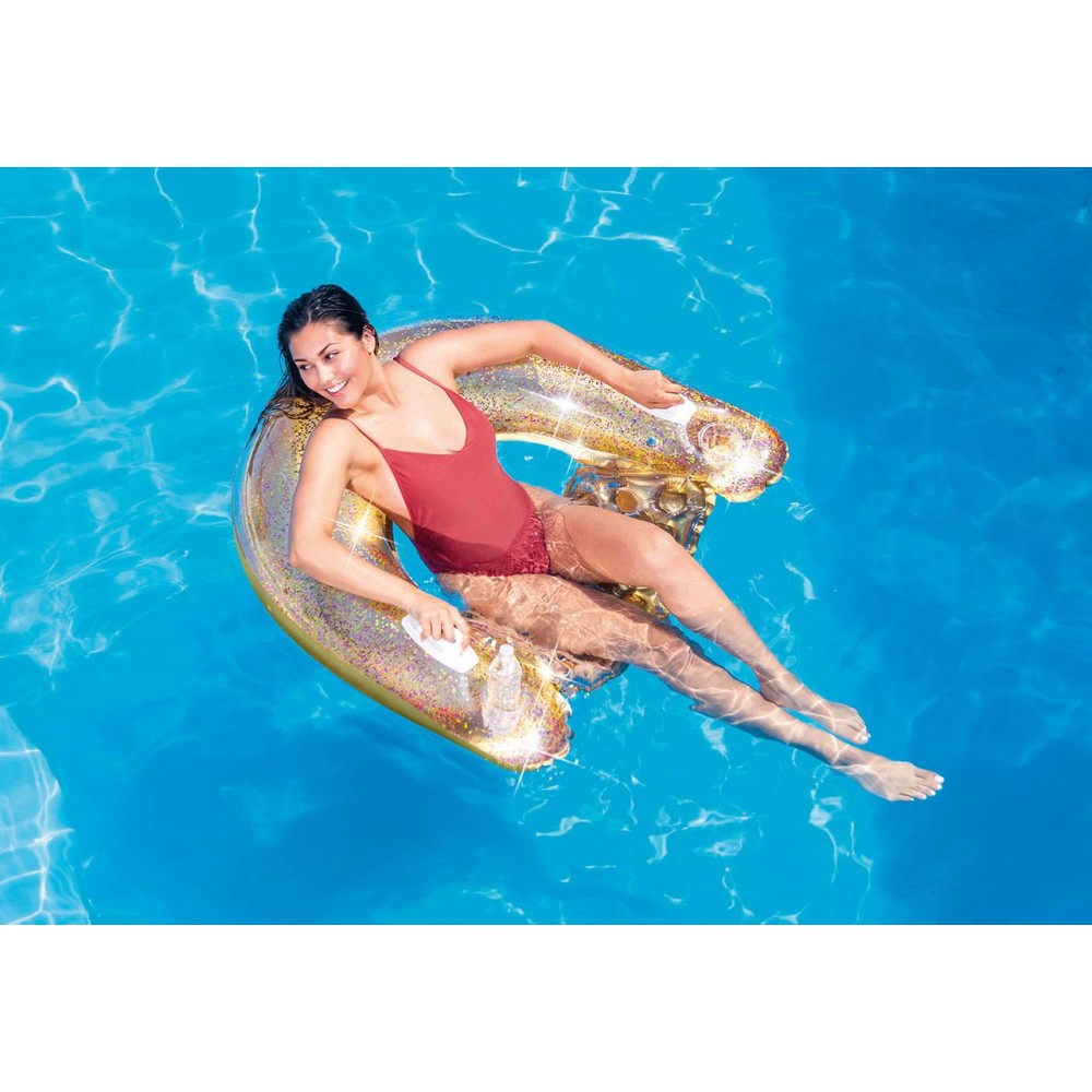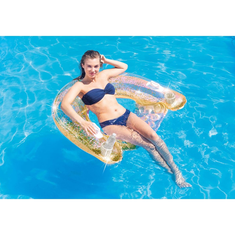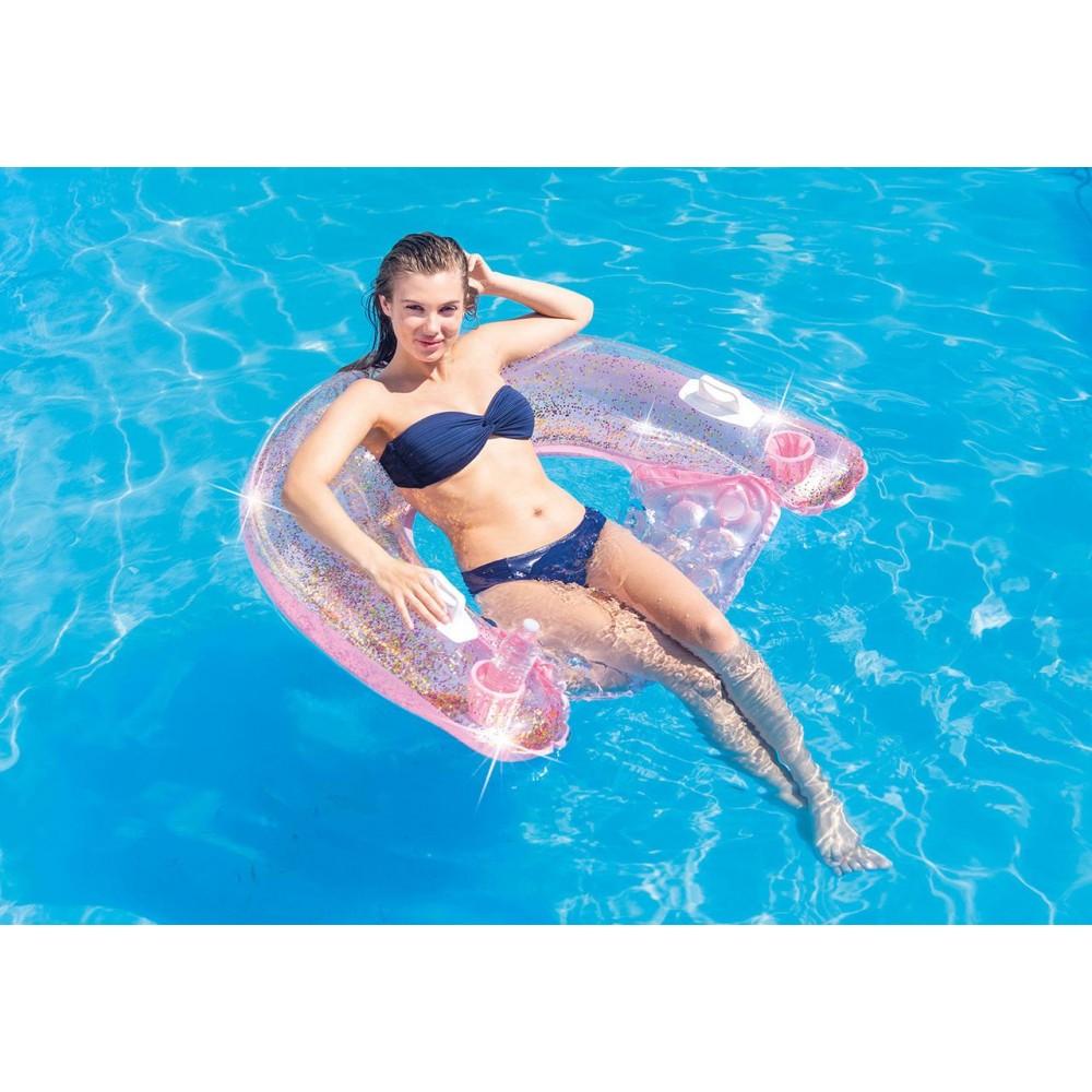 Intex Glitter Sit’ N Floats is stylish, comfortable and filled with glitter! It is designed with a comfortable backrest and a sturdy seat perfect for lounging at the lake or pool. With a transparent top panel and a colorful bottom, two air chambers for extra buoyancy and two grab handles for stability, this uniquely designed float is sure to provide a fantastic relaxing experience. Also included are two cup holders for a refreshing drink while you enjoy time in the water.