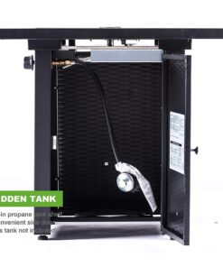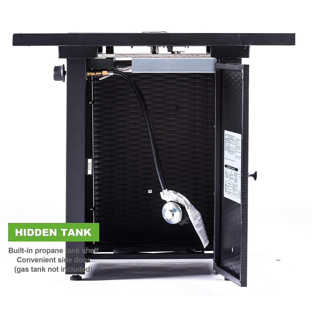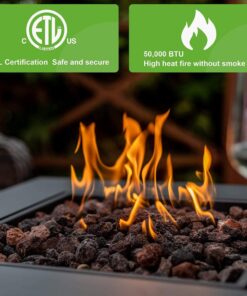 2.Safe and ETL Approved – Our firepit uses stainless steel burner with highest safety standards is rated 50,000 BTU for terrific flame presence while the push button spark Piezo ignition system provides simple and convenient control when lighting. Easy and simple access to interior storage of standard 20-lb propane tank (not included).