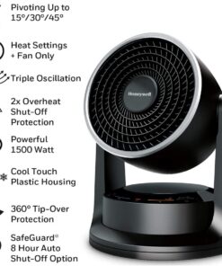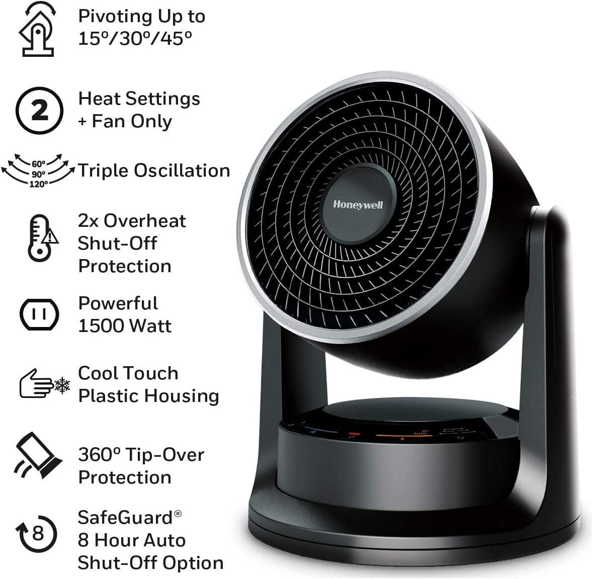 - FEEL THE POWER – The Honeywell Turbo Force Power Heater + Fan is designed to offer powerful heat and circulation, on demand, so you’re always comfortable. This fan heater combo oscillates for wide-area heating and three settings: high, low and fan only.