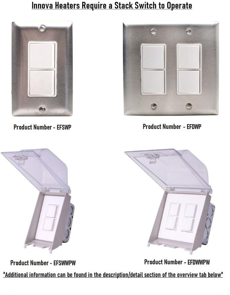 - Easily control all Innova heaters with this stacked switch, with high/low and on/off settings. Featuring a stainless steel cover and single or double gang box that allows it to be installed in-wall.