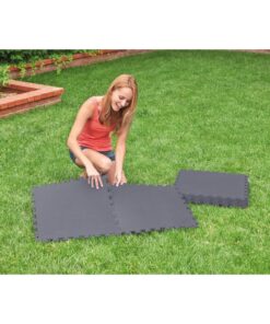 - The comfortable and durable Polyethylene material is composed of 8 pieces for a total of 20 square feet of interlocking tiles.