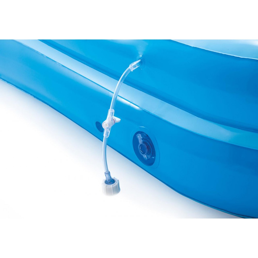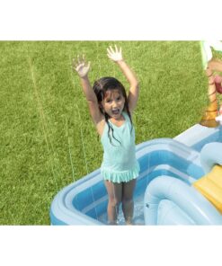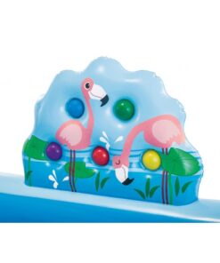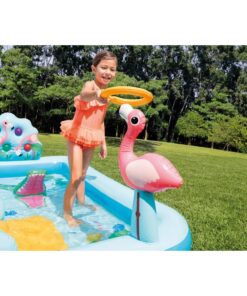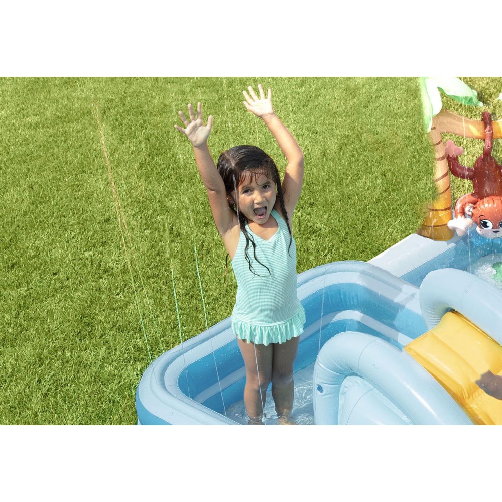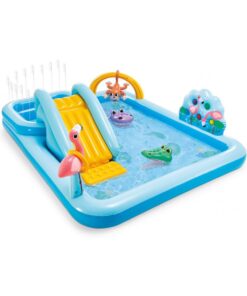 Keep your kids cool during the summer with the Intex Jungle Adventure Play Center. There are two pools in this play center. Your kids will have so much fun sliding and splashing into the water, playing with the inflatable palm trees, flamingo and money. It also comes with a ring toss game and 5 balls to fit into the wall. The landing mat is designed with soft padding for safety. Simply connect the garden hose and adjust water flow with the control valve. The smaller pool is equipped with overflow drain hole, so that water doesn’t fill higher than 4.5in. The water capacity of the bigger pool is 8in, 130 gal. The maximum weight limit of this play center is 178 lb.