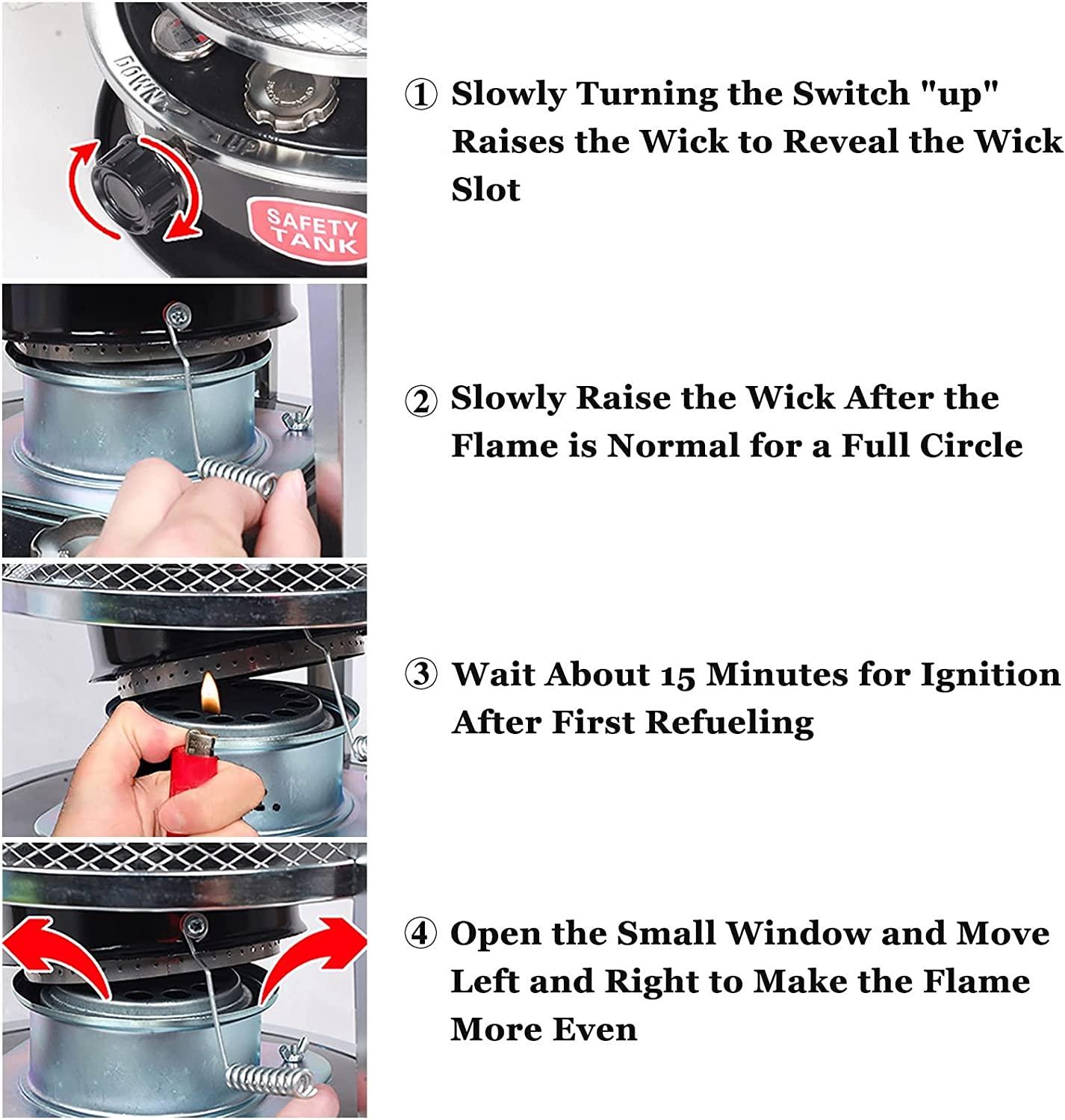 - ✅ Package includes: Kerosene Heater x 1, english manual × 1, storage bag x 1, wick x 8, wear-resistant gloves x 1 pair, oil pump x 1, funnel x 1. (A wick usage time: about two months)