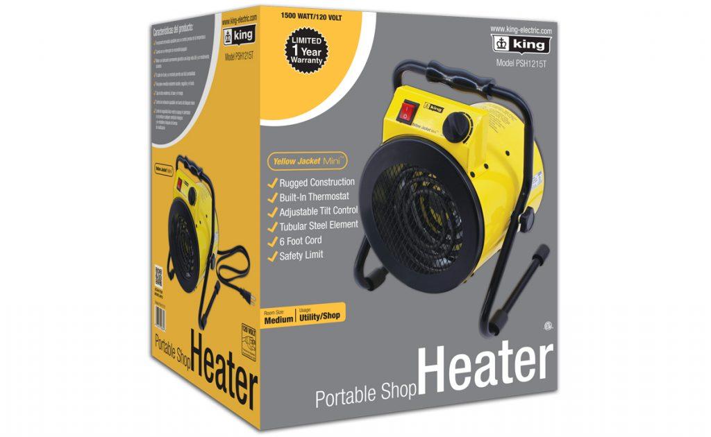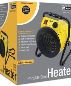 Now with a high mass Spiral Finned Heating Element! The King Electric Yellow jacket Mini is a rugged portable heater designed to provide supplemental heat at an affordable price. Perfectly suited for personal use applications and small workshops/worksites. The convenient 6 foot cord allows greater mobility to areas needing heat. Easily set the desired temperature with the built-in thermostat. Sure stop high-limit temperature control provides overheat protection. Standard color: yellow body, black grill and handle.
