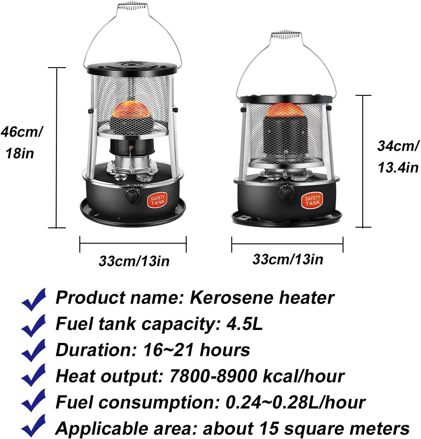 - ◈Special Design◈: Portable kerosene heater does not require electricity. You just need oil and you’ll have plenty of heat. The kerosene heater has the characteristics of quietness, energy saving, cleanliness and environmental protection. Our heaters have a capacity of 4.5 litres and are available in two capacities.