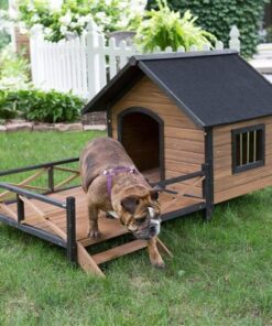 - Large Solid Wood Outdoor Dog House with Spacious Deck Porch