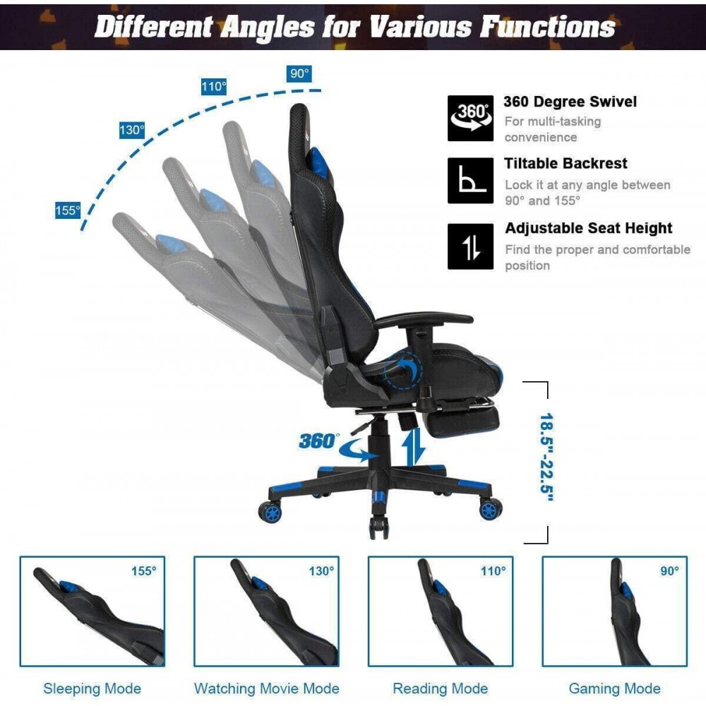 - 【Adjustable Backrest & Retractable Footrest:】The angle of the backrest can be adjusted within the range of 90°-155°, meeting different needs for work, games and sleep. Besides, retractable footrest supported by metal tubes offers your legs a rest area when you lie on the chair.