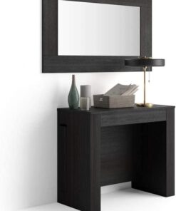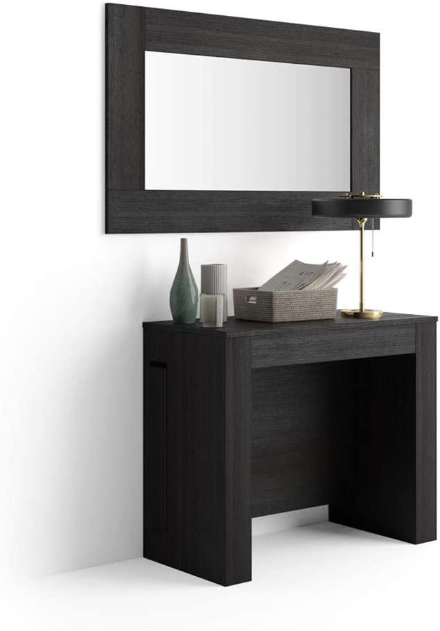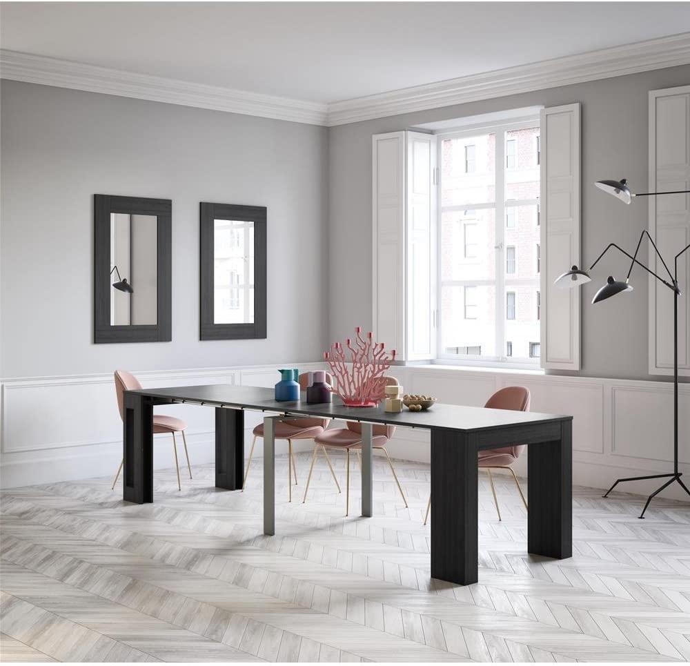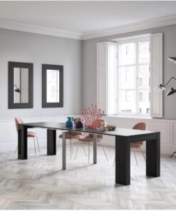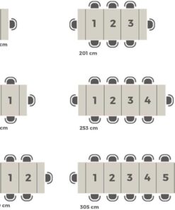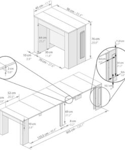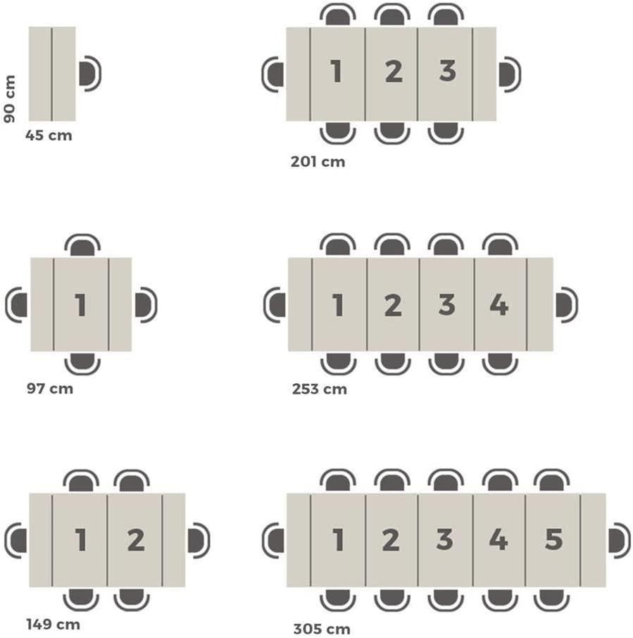 - MEASUREMENTS: Depth: 35.43 in. Height: 29.92 in. Min. length: 17.71 in. Length with one leaf 38.18 in, with 2 leaves 58.66 in, with 3 leaves 79.13 in, with 4 leaves 99.60 in, with 5 leaves 305 cm. Seats up to 12 people. Chairs not included.
