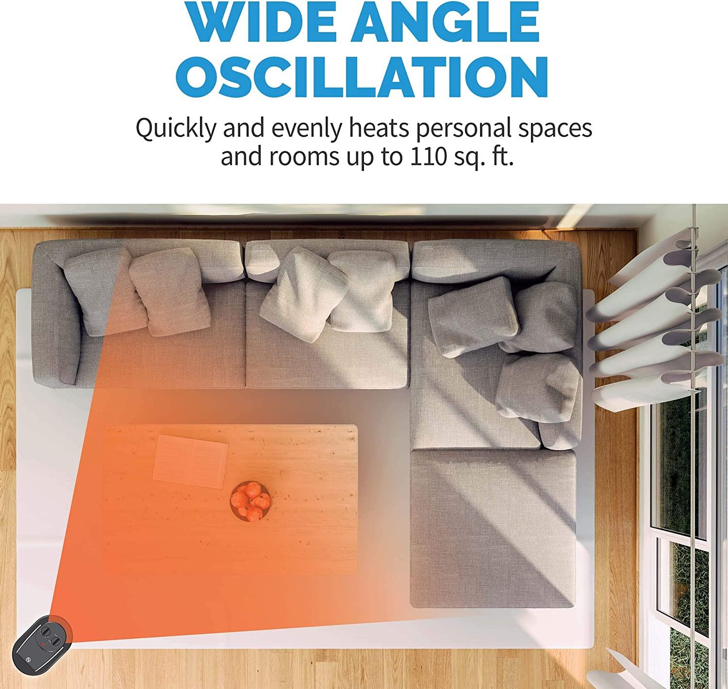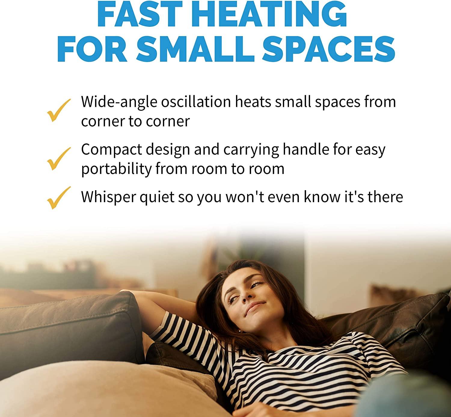 - [Spot Heater for Small Spaces] Combat winter’s chill with this portable ceramic space heater. Ideal for warming personal spaces like your cubicle or a small bedroom up to 110 square feet, this heater features a wide-angle fan to quickly distribute heat and keep you toasty.