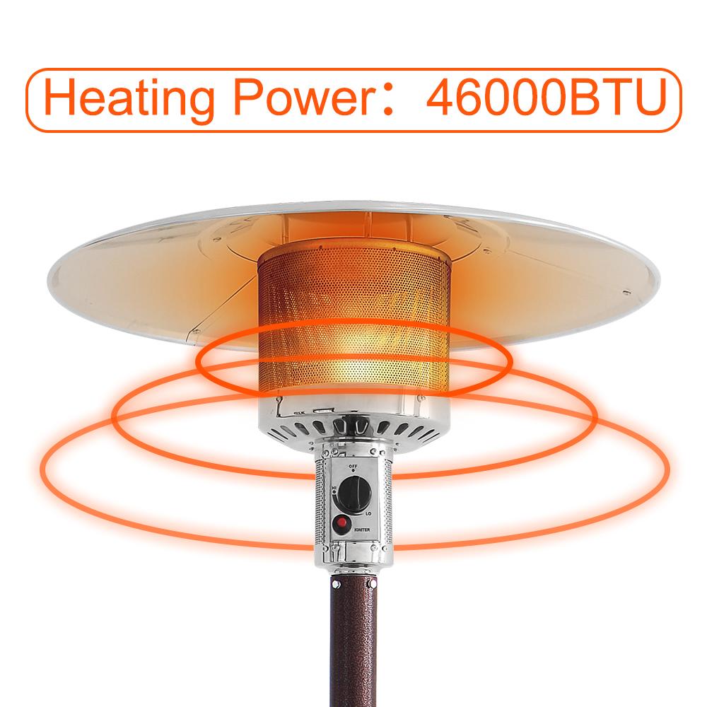 - (PUT LOTS OF HEATER:)The patio heater’s high output is 46000BTU, use it out on the patio at night in the late fall/winter time, the outdoor puts out a lot of heat, it’s a suggestion that start out with the gas patio heat on high but usually turn it down after the area heats up, a tank of propane lasts a couple of weeks