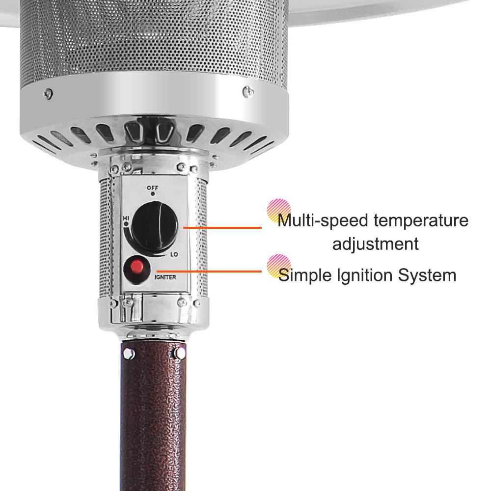- (HIGH QUALITY MATERIAL:) The patio heater use high quality stainless steel of the heating element which isn’t easy to melt/burn off, and the outdoor heater fire can’t come through the grating and melted the rim, the gas patio heater has ETL certification, which can make sure the quality is excellent. Please pay attention that use the heater outside