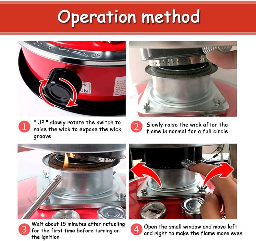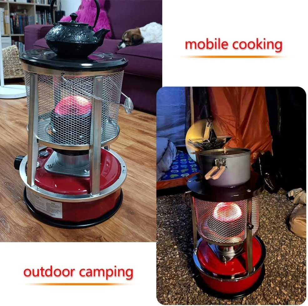 - 【Fire Adjustment Knob】Kerosene Heater Stove has a rotary adjustment valve to adjust the fire according to your needs; no noise and glare, easy to use every night. The heating table at the top can be used as a work table to cook food, and there is a protective net outside the kerosene stove to effectively prevent burns.