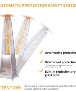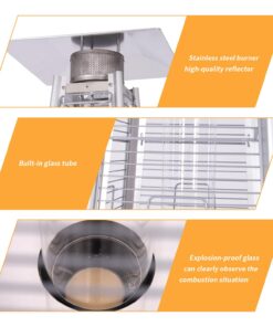 1.Quality Material Design:The heater is made of high quality stainless steel and glass tube, it’s designed to Provide and maintain optimal durability and perfectly complement your patio furniture and outdoor decor.