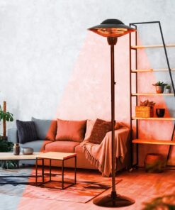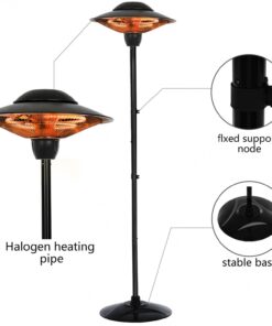 Freestanding electric patio heater size: Diameter is 17.3 inches and height is 78 inches; 120V,60Hz,1500W. It is very easy to install and only partial assembling is needed. Two adjustable height from 6.5 ft to 5 ft with dismountable pipes make this heater more user friendly. It has a cord switch that easy to contral the heater. Don’t tou/ch the heater at work to avoid scalding.