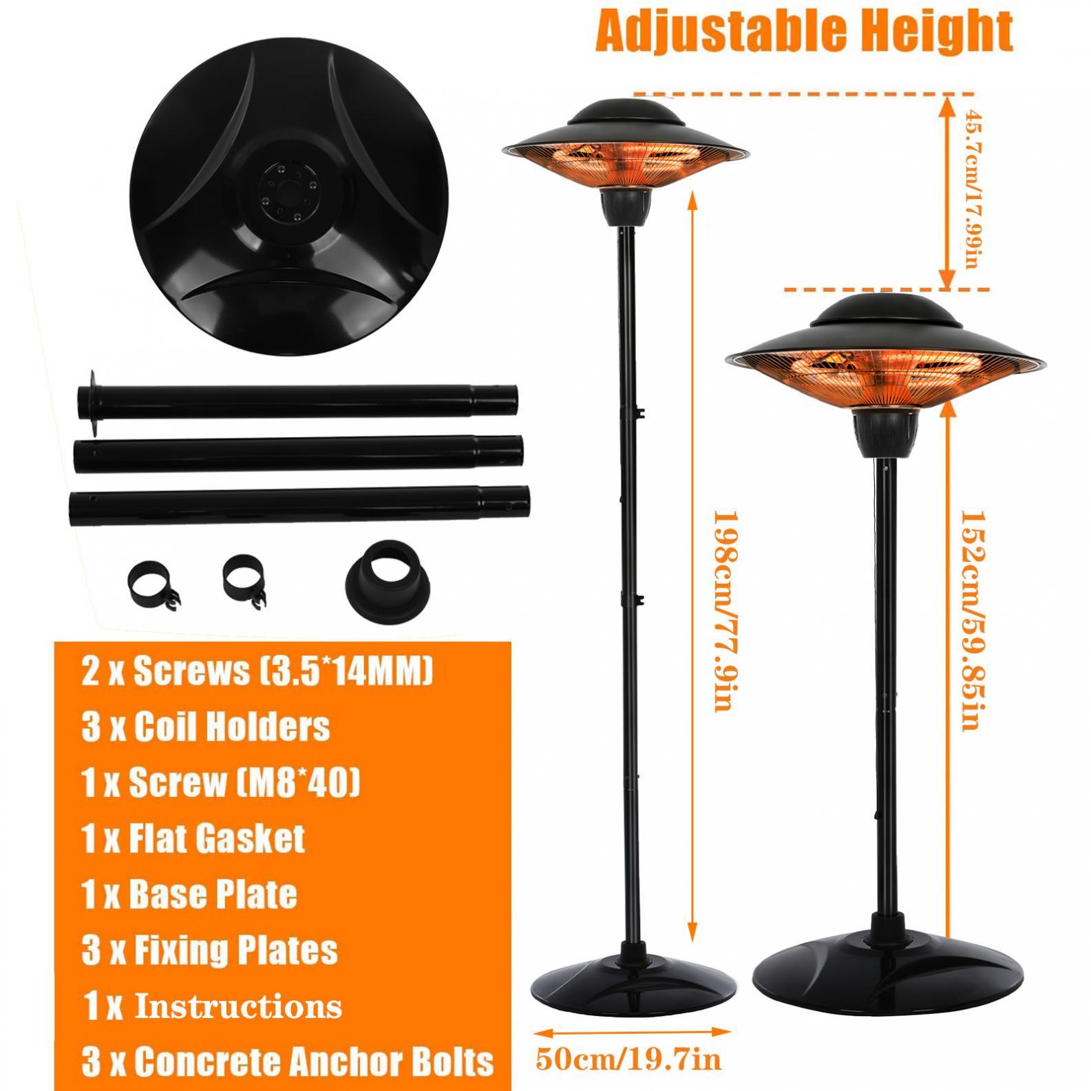 Freestanding electric patio heater size: Diameter is 17.3 inches and height is 78 inches; 120V,60Hz,1500W. It is very easy to install and only partial assembling is needed. Two adjustable height from 6.5 ft to 5 ft with dismountable pipes make this heater more user friendly. It has a cord switch that easy to contral the heater. Don’t tou/ch the heater at work to avoid scalding.
