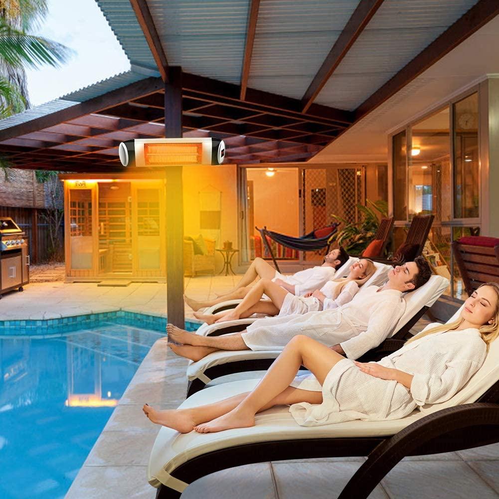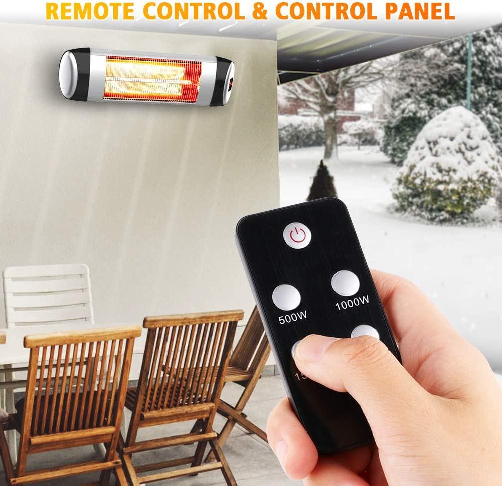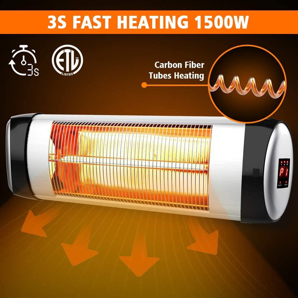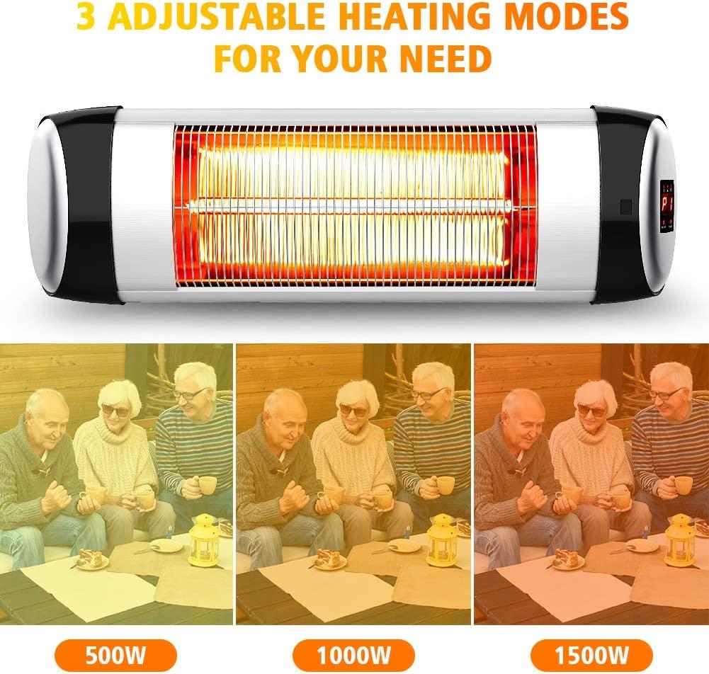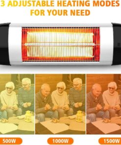 - 【Fast Heating & 3 Heat Settings】- PATIOBOSS electric patio heater use advanced heating technology with carbon fiber tubes, 95% of electricity can be converted into heat, and delivers heat directly to people or objects with 100% noise . And you can choose an ideal level depending on your preference from 500W,1000W,1500W. Just need 3 second, we will feel comfortable warm like sunlight in cold winter.