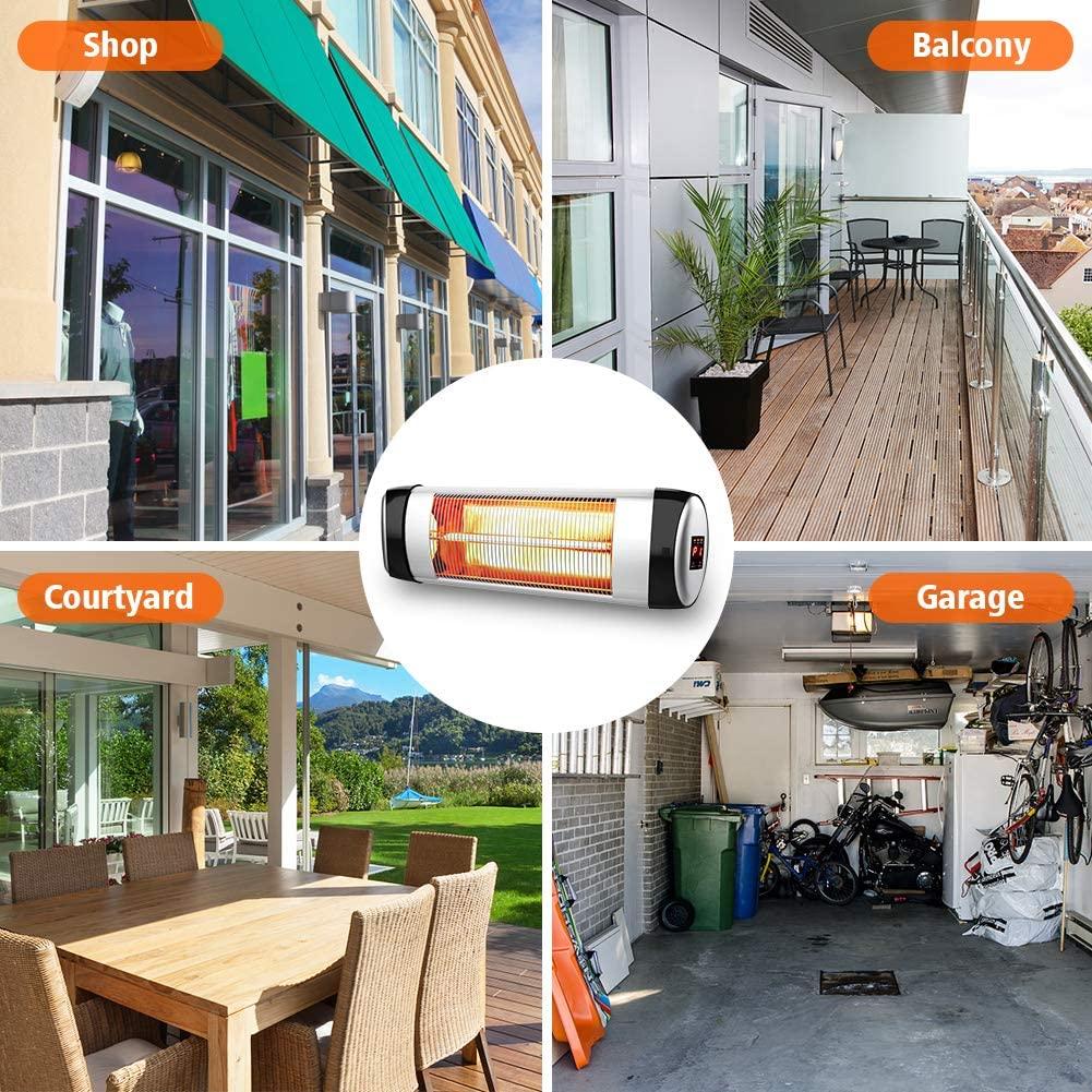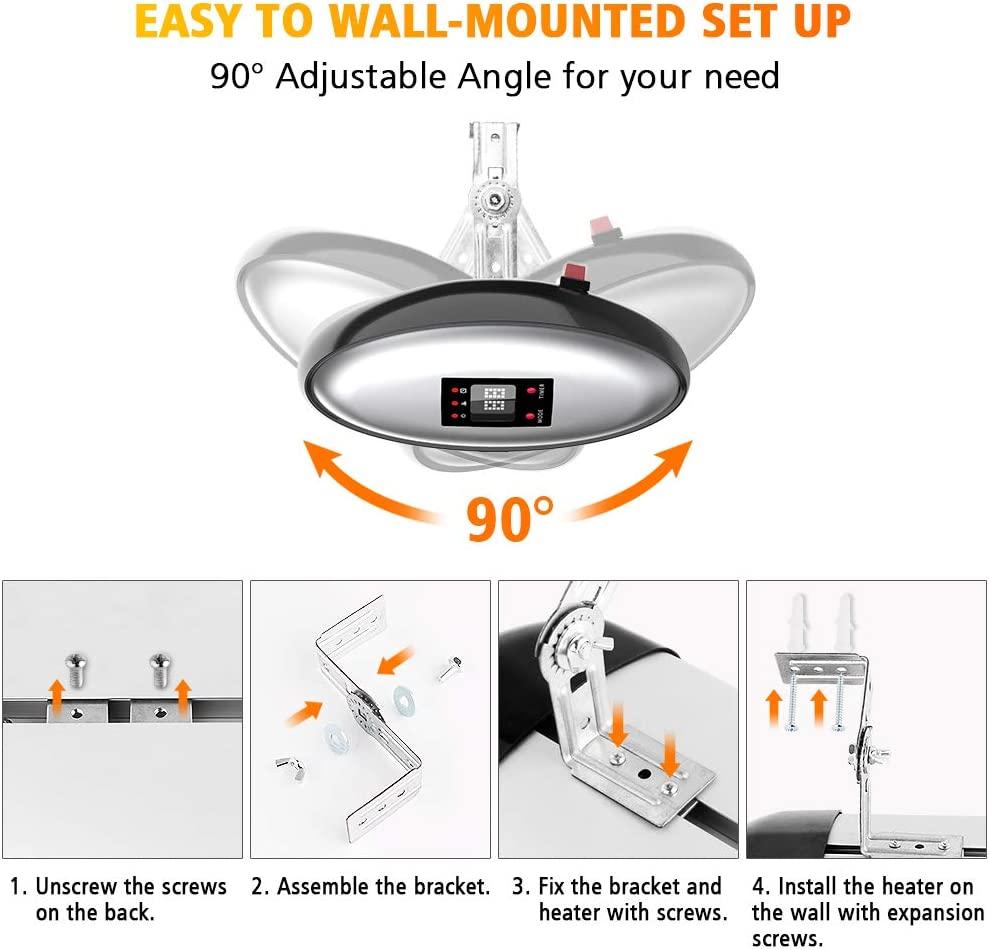 - 【Easy to install & Use with Remote Control】- PATIOBOSS wall mounted patio heater equipped with 4 mounting brackets and fasteners, you can mount the infrared heater on the wall easily in only 4 steps refer to the user manual to save space. The heater can tilt up or down to angle toward you. Meanwhile, control panel and remote control help you to choose the levels without moving. Get the warmth you want easily.