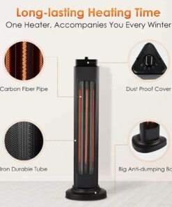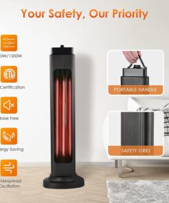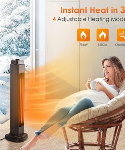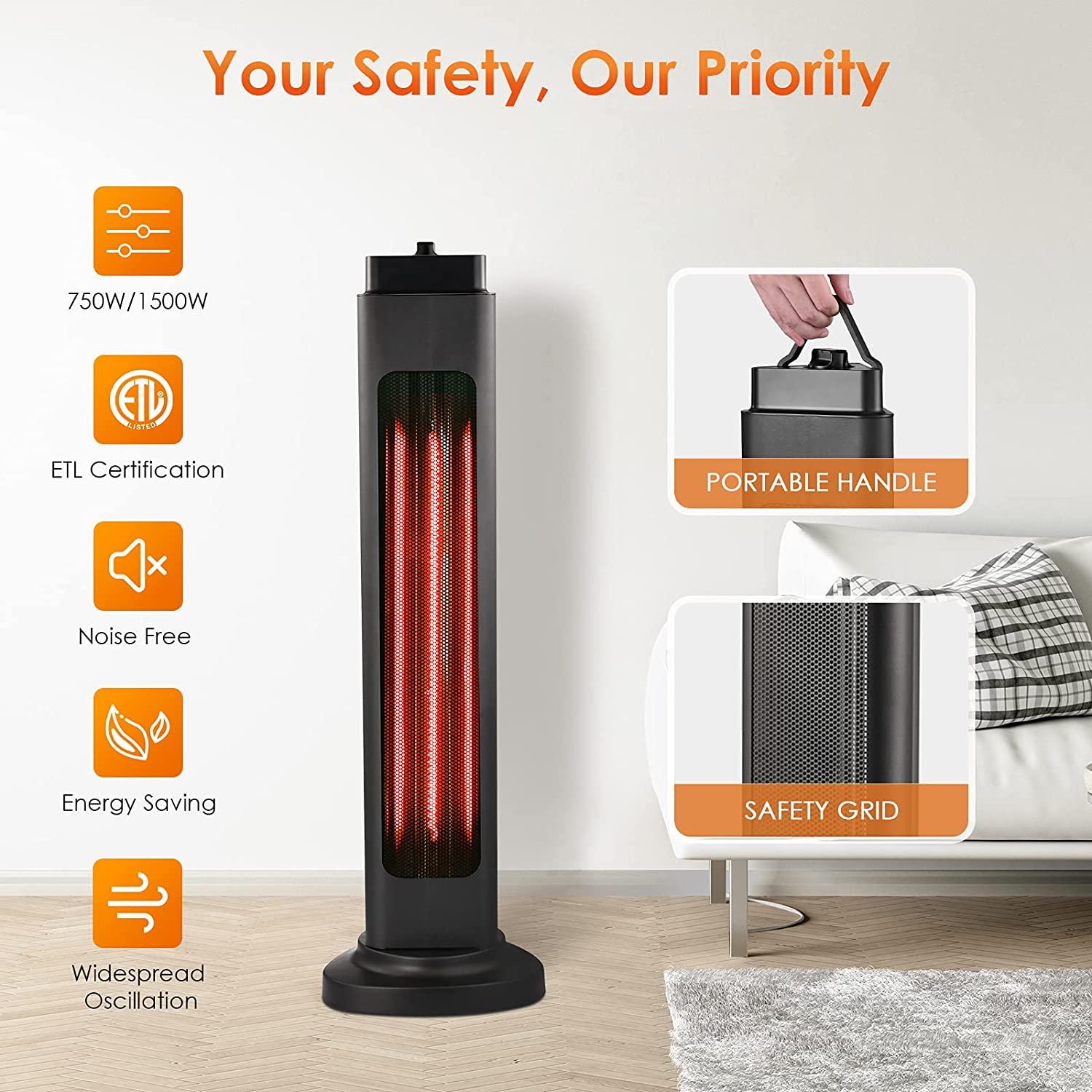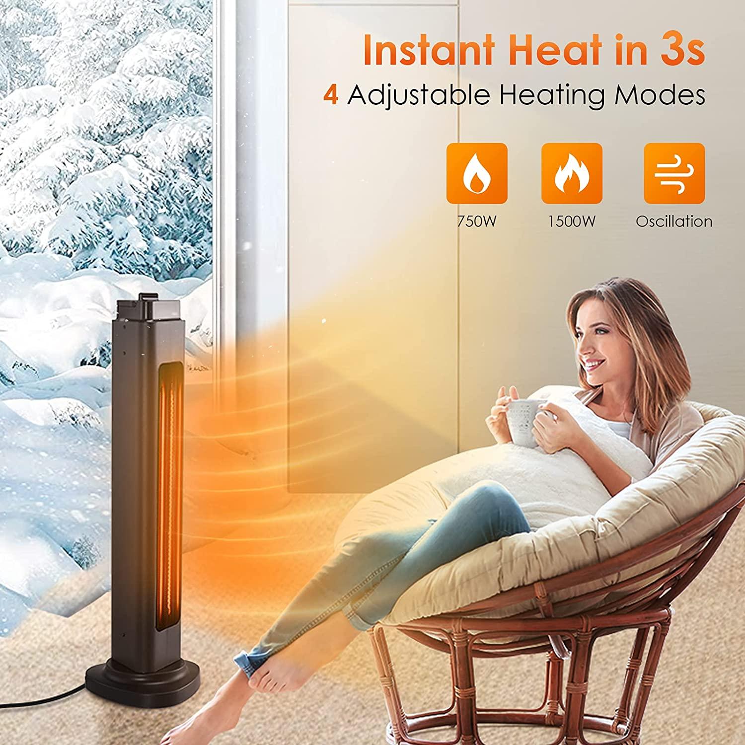 - 3s Instant Heat & 4 Adjustable Modes; Equipped with a carbon fiber heating tube and under the rated power of 1500W, the space heaters for indoor use can heat up in 3 seconds a relatively small space like a bedroom; The patio heater comes with 4 adjustable heat setting modes to your different needs: 750W, 750W+Oscillation, 1500W, 750W+Oscillation; You can simply spin the switch to get the mode you want