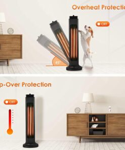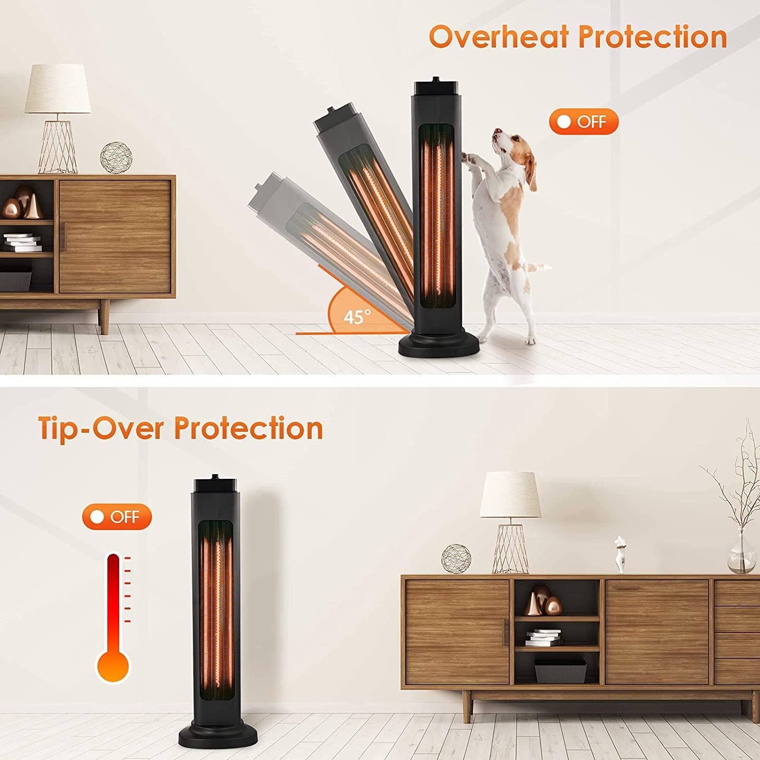 - Multiple Safety Protection; This ETL certified outdoor heater has over-heating and 45° tip-over protection; The outdoor patio heater can automatically cut off power when it is knocked down by accident or internally overheated; So there is no need to worry about the accidents caused by your children/pets or forgetting to turn off the electric heater; The auto shut-off and overheat protection ensures you a comfortable experience when you use it; Your safety is always our priority