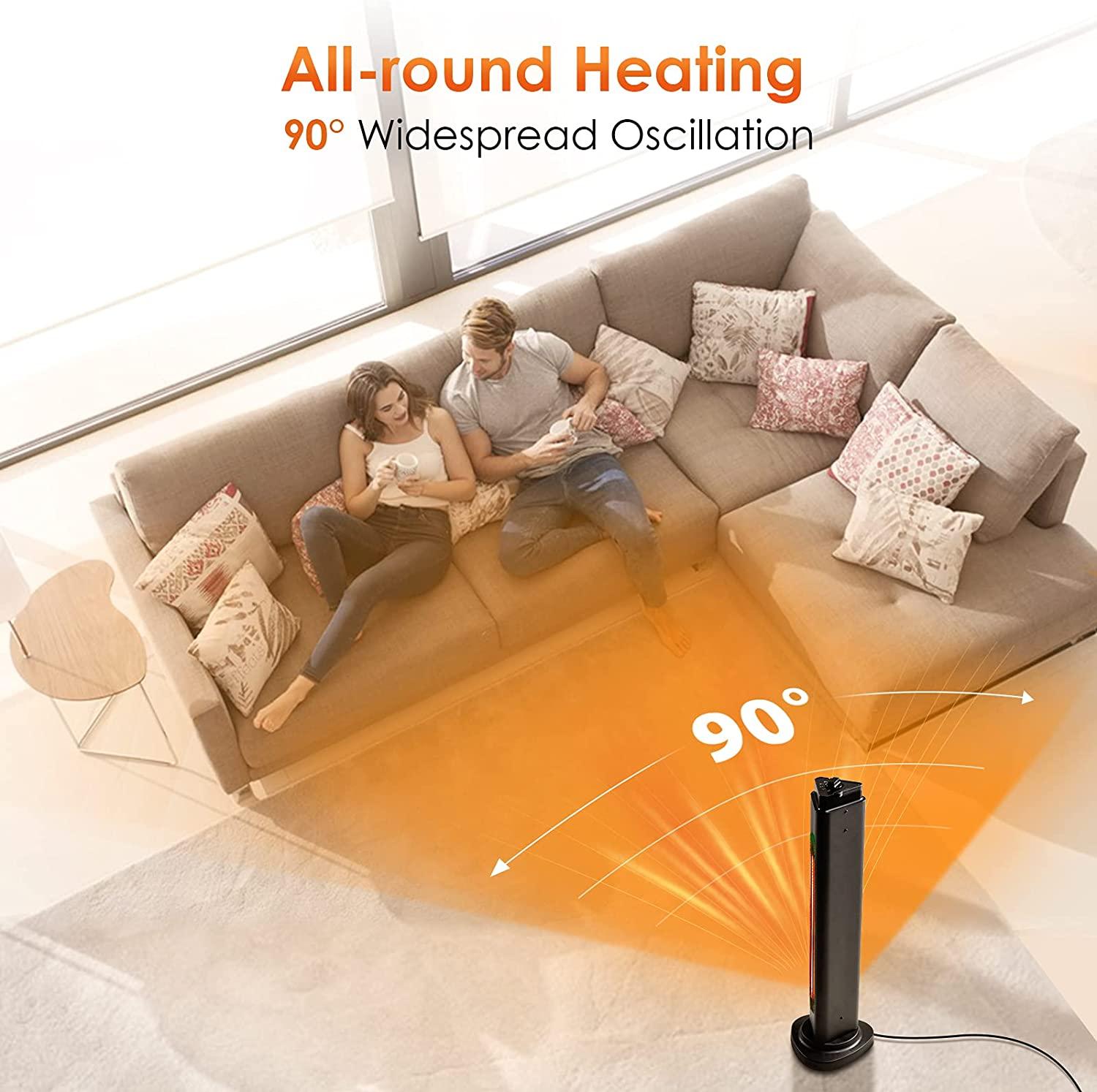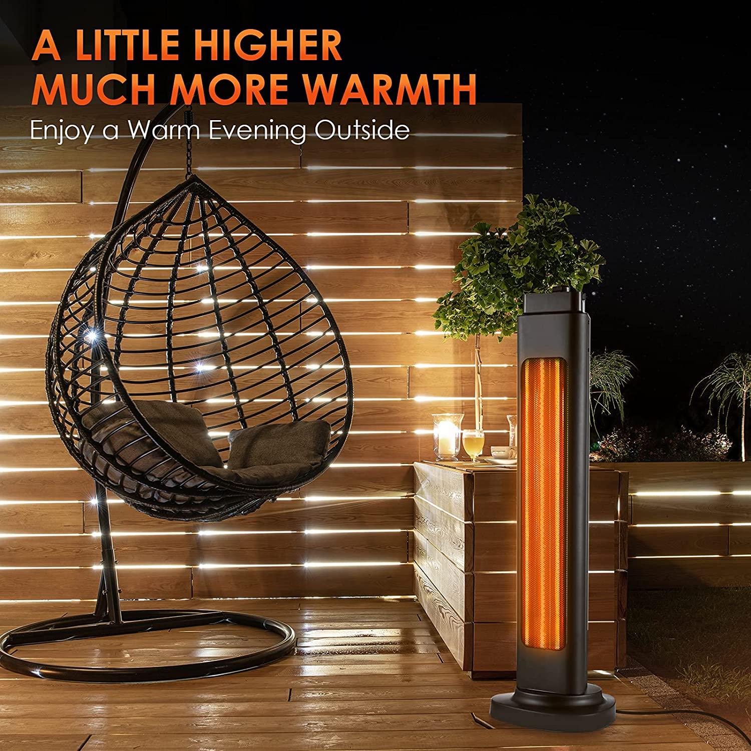 - Embraced by All-round Toasty Heating; Compared with other outdoor electric heaters, our heater is 32.87 inches tall; Whether you are sitting or standing, you can easily feel the warm heat flowing through your body; Furthermore, our outdoor/indoor electric patio heater has a 90° wide-range oscillation, which greatly expands the heating distribution range; With a higher electric heater for the home, you and your family can quickly and easily enjoy the warmth together