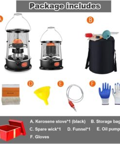 - 【Package Includes】Kerosene Stove Burner *1, storage bag*1, spare wick*1, spare rotary switch*1, funnel*1, suction tube*1.