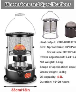 - 【High Calorific Value】High calorific value and large heating range. The maximum calorific value is 8900 BTU/H (equivalent to 3000W), and the fuel consumption per hour is 0.24~0.28L. Can make the room of about 20 square meters rise rapidly.