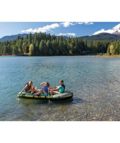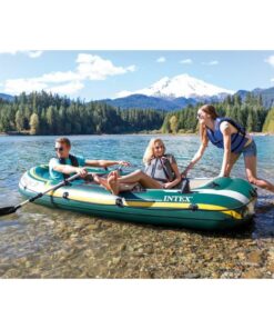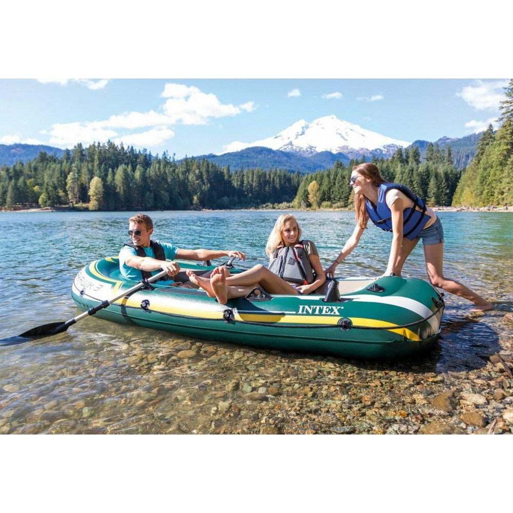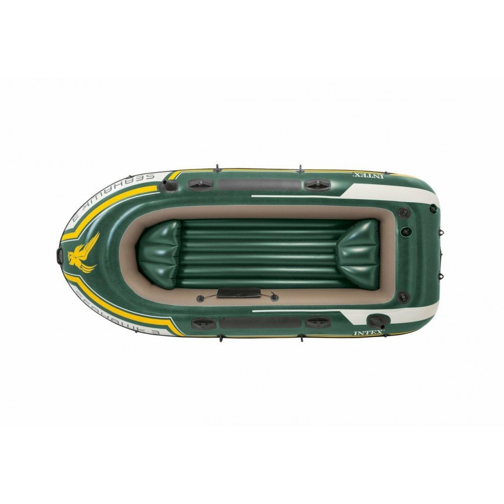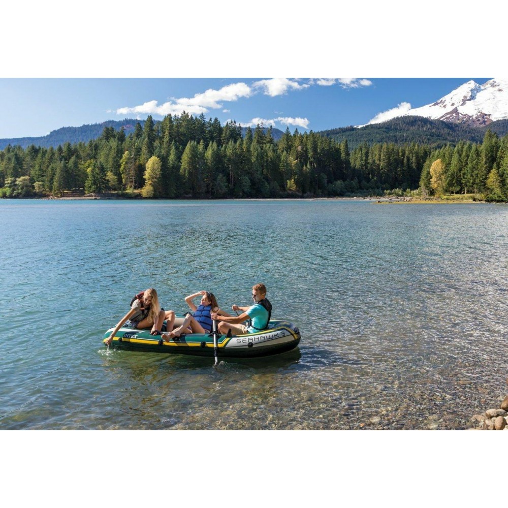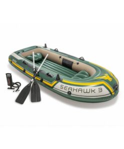 Whether you’re fishing, relaxing, or rowing on the lake, the SeahawkTM 3 inflatable boat is great for making your boating experience exciting and entertaining. Designed with heavy duty, puncture resistant PVC for comfort and durability, and an inflatable I-beam floor for rigidity, the boat contains three air chambers including an inner auxiliary chamber inside the main hull for extra safety. Inflating or deflating is a breeze with two quick-fill Boston valves. Fishing and relaxing have never been easier with the two built-in fishing rod holders and gear pouch. Motor mount fittings are included for the flexibility of adding the Intex® motor bracket and trolling motor. A grab handle on the bow and an all-around grab line are provided for your convenience, as well as welded oar locks, oar holders and a repair patch kit. The SeahawkTM 3 Boat Set provides added accessories including: two 48 inch French oars and an Intex® high-output pump for easy inflation and deflation.