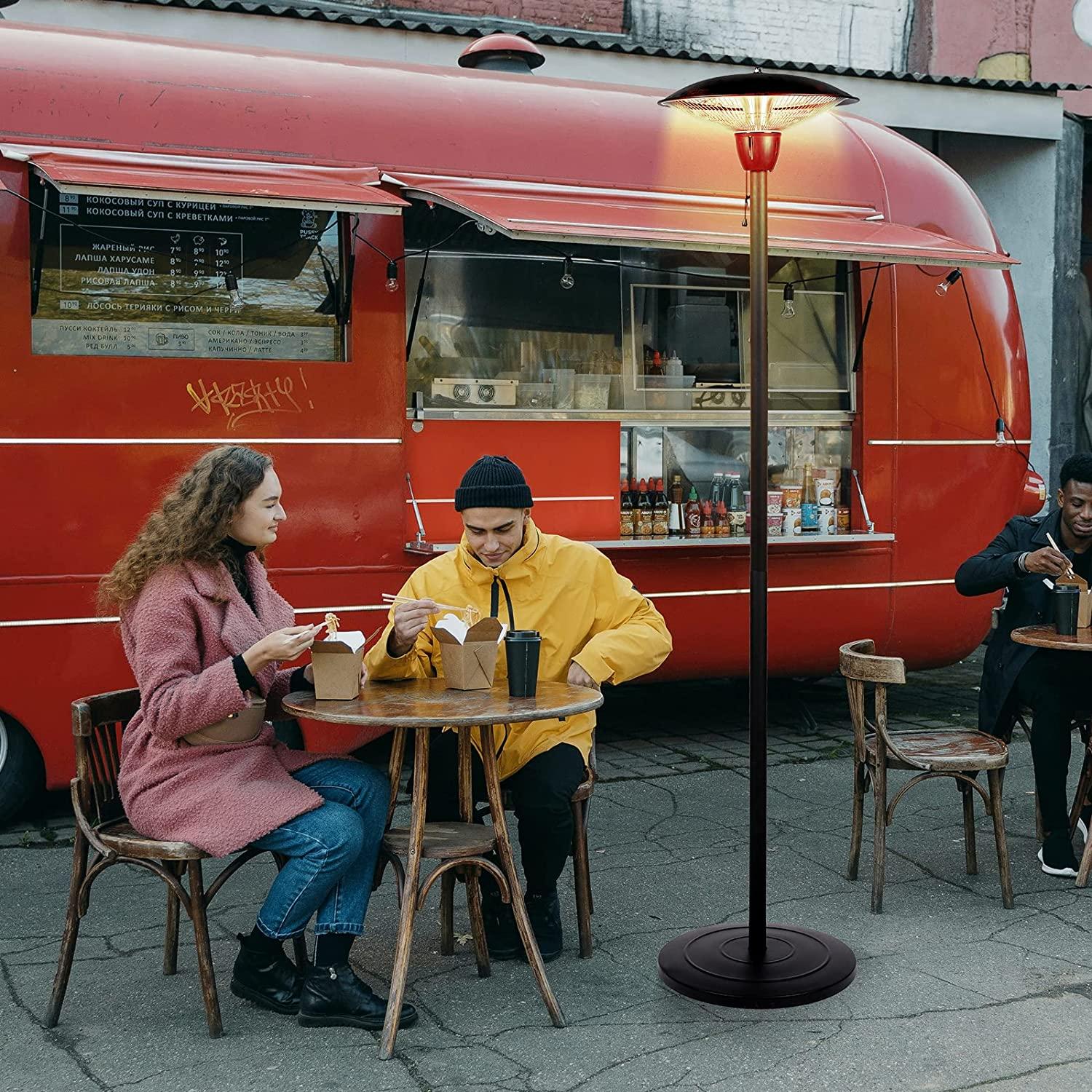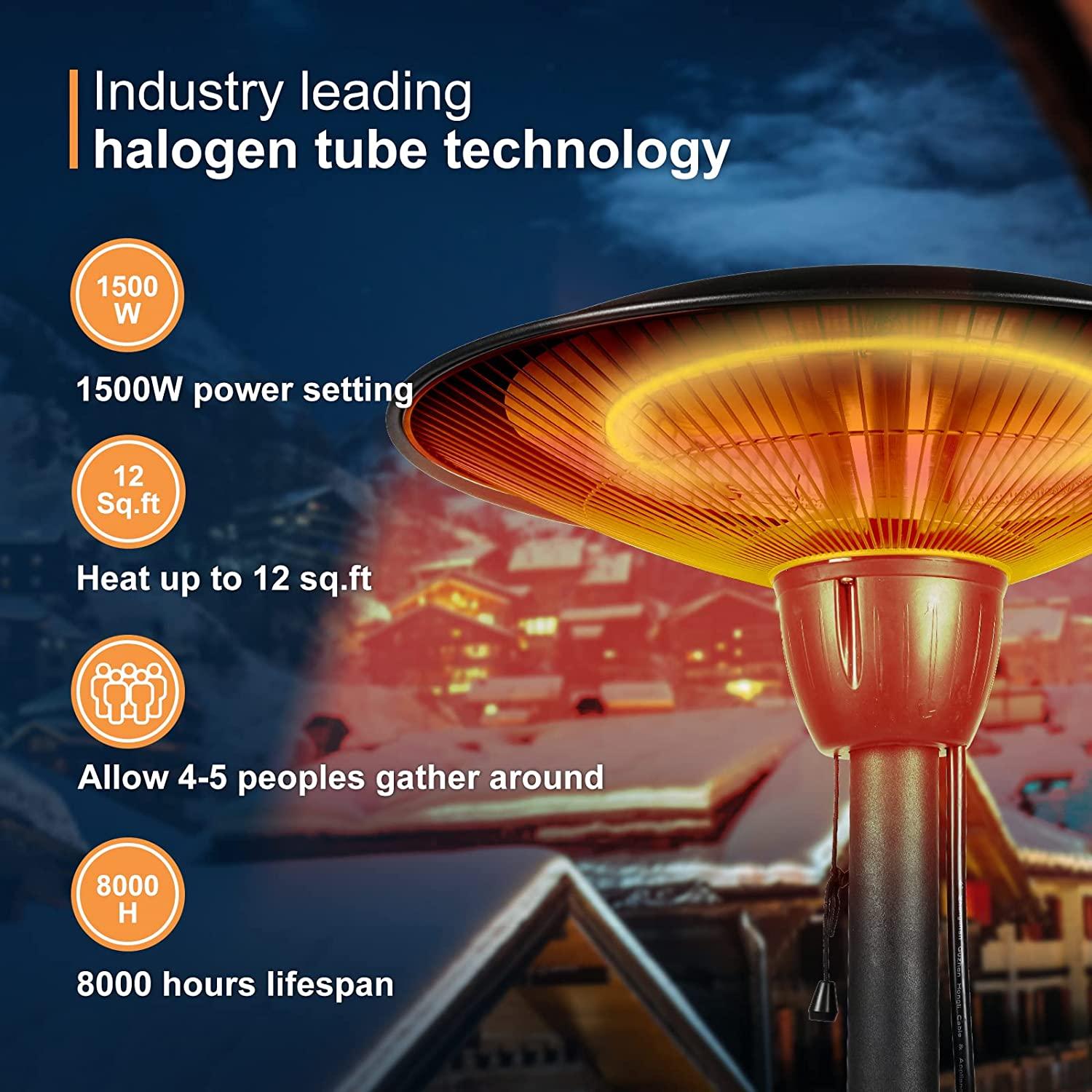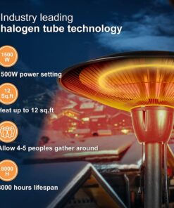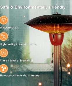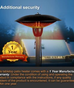 Simple Deluxe 1500W Patio Electric Heater,Outdoor Patio Heater Infrared Heater for Camping,Black.Great quality and good heat output It makes chilly days comfortable, You can run the burner and radiates very comfortable heat. Easy to ready heater for use very efficient . it takes less then 2 seconds to light and about 10 seconds to get hot.and the area it can heat up is incredible.Let you get warm everywhere in the most convenient way.Light weight and easy to move: This Table Top Patio Heater is designed for convenience and style. Its dimension is 26 in H x 17 in dia. and only weight 25lbs.The heater is surprisingly sturdy for something so relatively lightweight – it is very easy to move around, yet moderate wind doesn’t even shake it.Safety protection: : Electric Patio Heater pass ETL, CE, and IP34 certification. The Outdoor Heater covers the heating element to prevent pets or children from being burned when they accidentally touch the surface of the Infrared Heater. In addition, the Infrared Patio Heater has a stable circular base to avoid tipping over. Even if it is dumped, it will automatically cut off the power. The Patio Heater also has to overheat protection to protect your electrical safety.