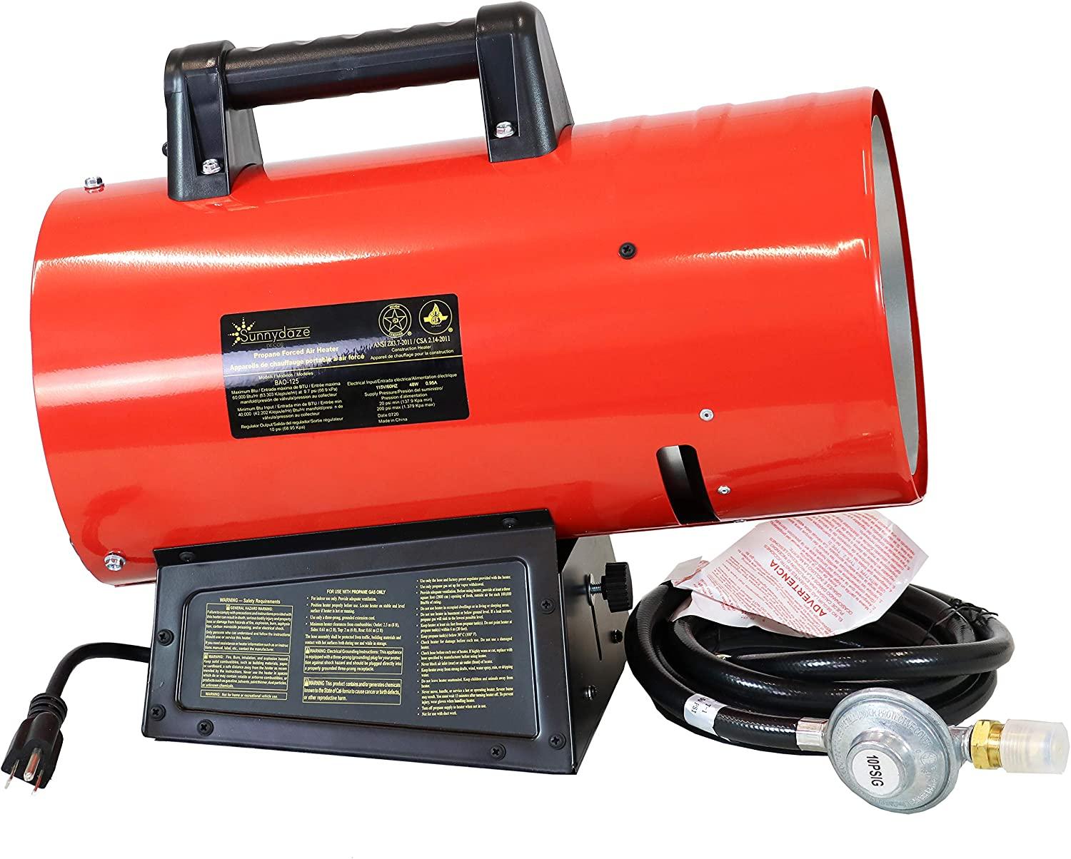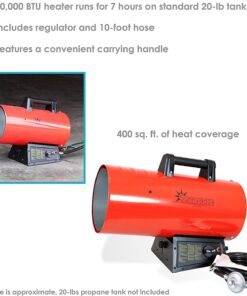 - Ideal during the winter: Product includes 1 forced air propane heater, regulator and 10-foot hose; For optimum performance, it is recommended to use a 100-pound propane tank with this heater (please note, propane tank and fuel are not included with the heater and must be purchased separately); Smaller tanks can be used for limited run times