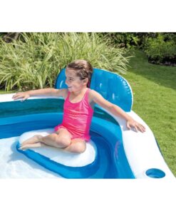 Make a splash this summer while playing in the Intex Swim CenterTM Family Lounge Pool! The unique shape allows for maximum play room and the wide sidewalls give extra comfort and stability. The four built-in seats with backrests are perfect for relaxing and lounging in comfort. Two drink holders are provided to hold your refreshing beverages while lounging.