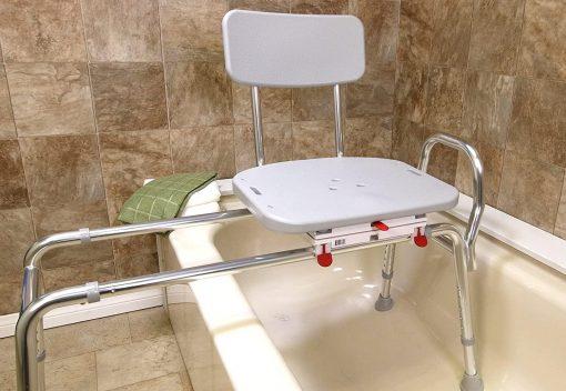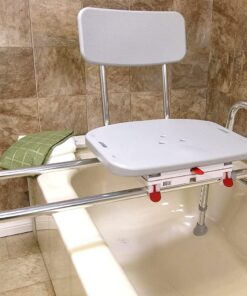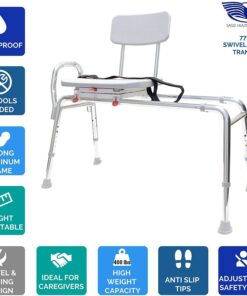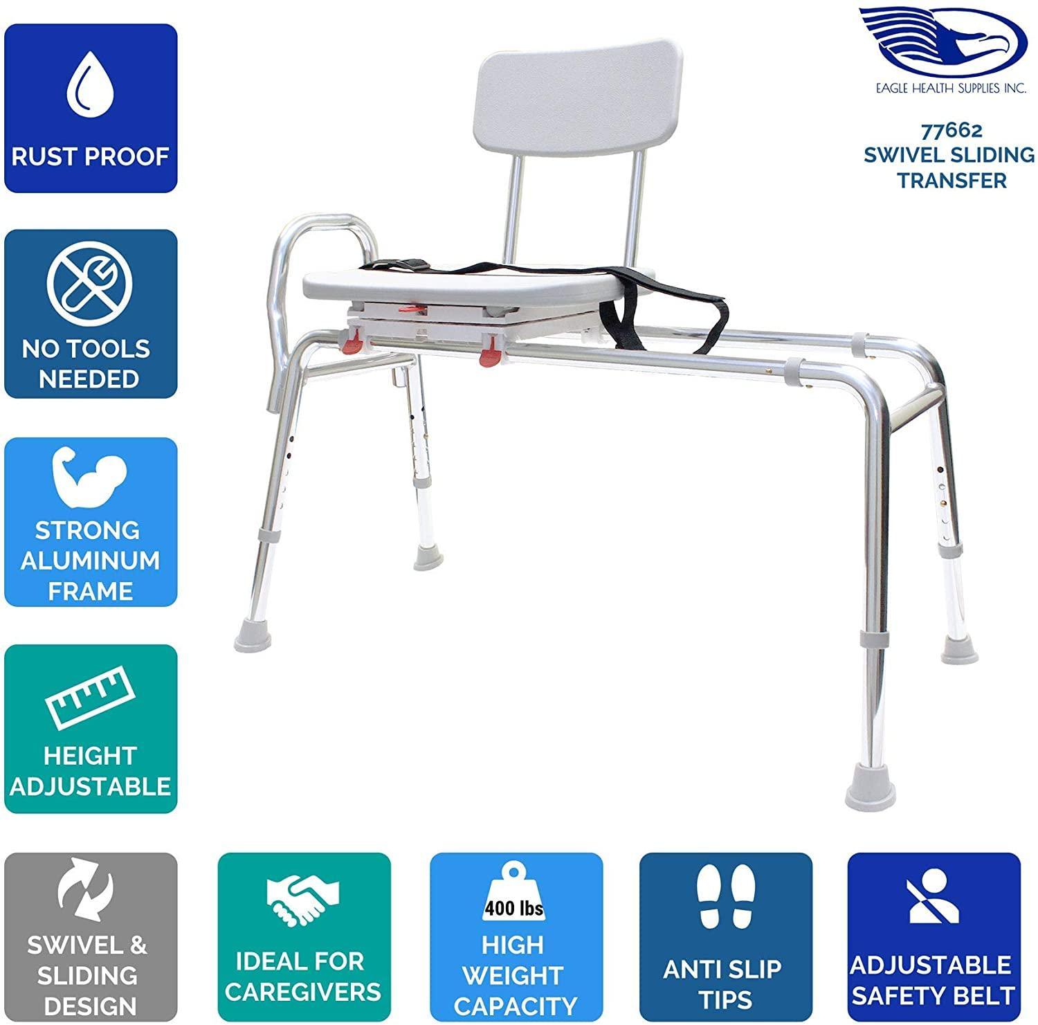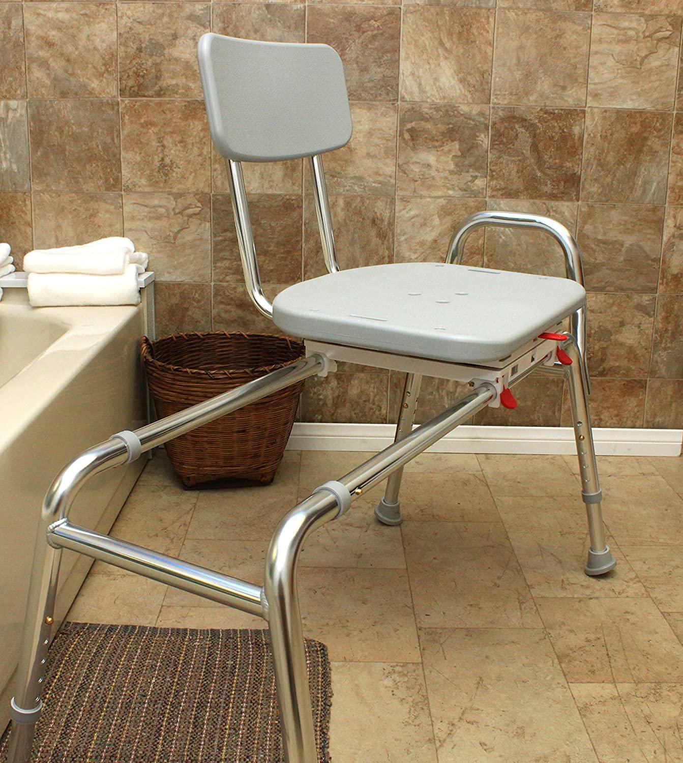 - EASE & COMFORT: Seat swivels 360°, locks every 90° for additional cleaning. Slide smoothly in and out of the tub/shower with ease. No more scooting! Reduce the risk of skin tears and infections! Less aches and pains for caregivers. Reclaim independence with this easy-to-use bath bench and sliding shower chair.