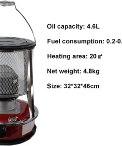- The combustion efficiency of the kerosene heater is 99.8%, high calorific value and large heating area. The maximum calorific value is 9000 BTU/H (equivalent to 3000 W) and the fuel consumption per hour is 0.25 l. Can quickly increase the space of about 20 square meters.
