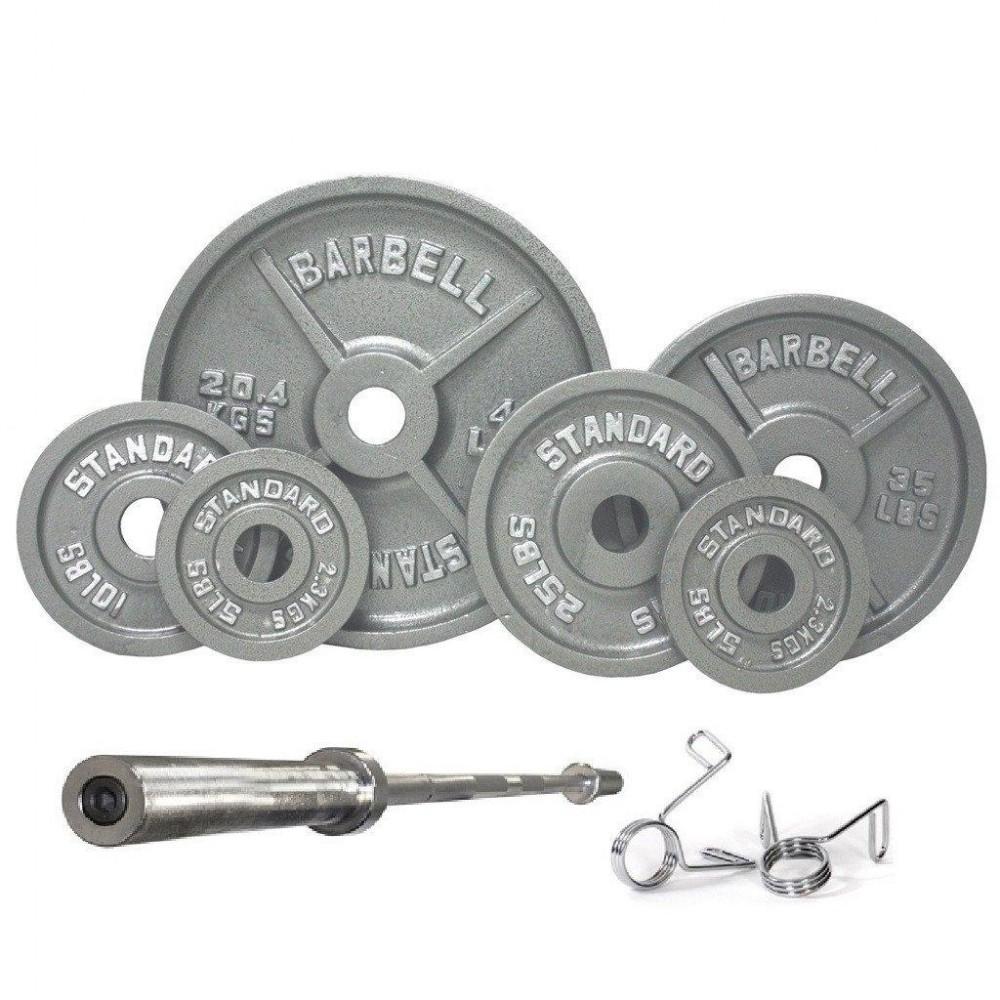 - The set includes one 7′ Olympic style bar with a finish, (2) 45 lb. weights, (2) 35 lb. weights, (2) 25 lb. weights, (2) 10 lb. weights, (4) 5 lb. weights, (2) 2.5 lb. weights and (2) spring collars