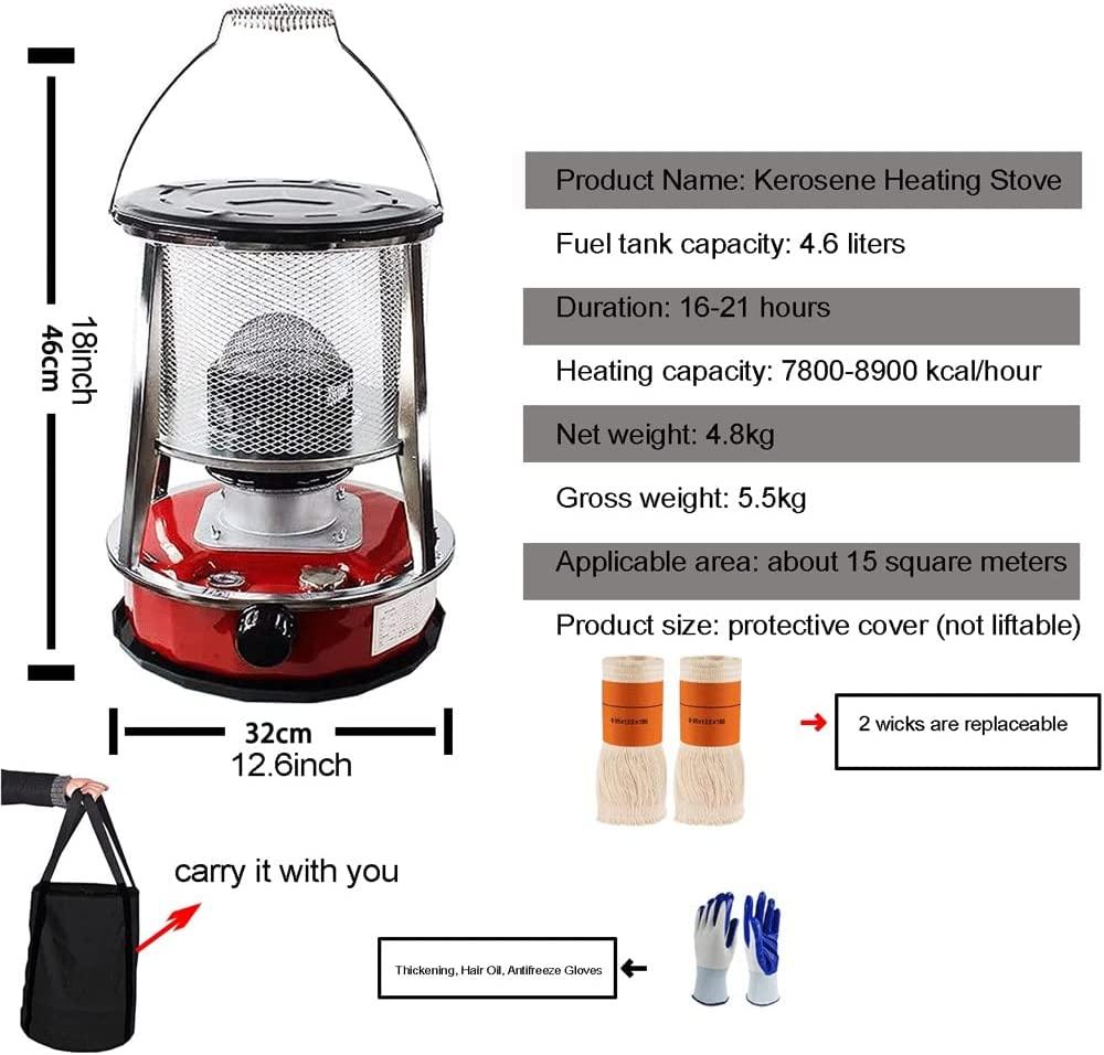 - ▲ Size: 32x32x46cm Fuel: Kerosene Fuel tank capacity: 4.5L. Fuel time: 16-21 hours (excluding kerosene fuel).
